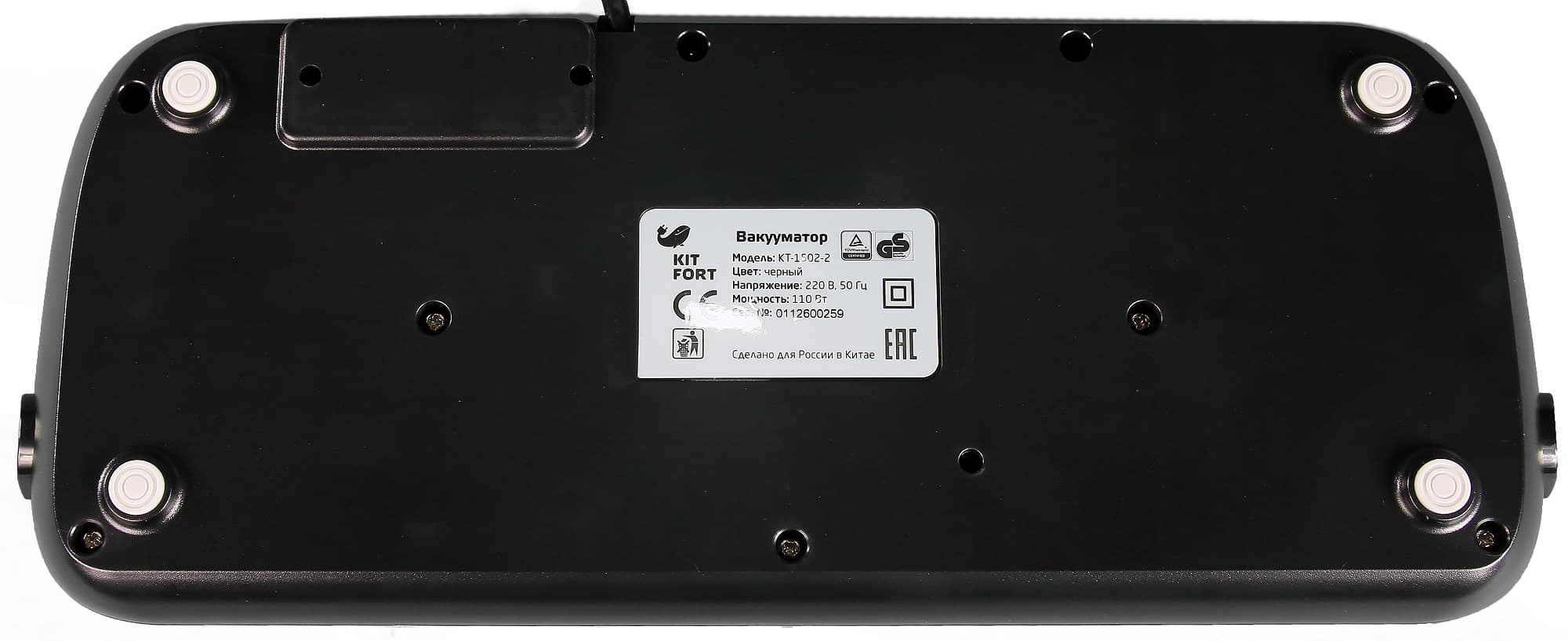 Визуально Kitfort KT-1502-2 производит впечатление качественно сделанного и симпатичного устройства. Верхняя панель оформлена то ли «под дерево», то ли «под металл» (сложно определиться, на что она похожа больше). Так или иначе, вакууматор наверняка «впишется» практически в любой кухонный интерьер. Хотя, конечно, вряд ли кто-то хранит этот прибор на видном месте. Остальная часть корпуса сделана из черного глянцевого и матового пластика.
