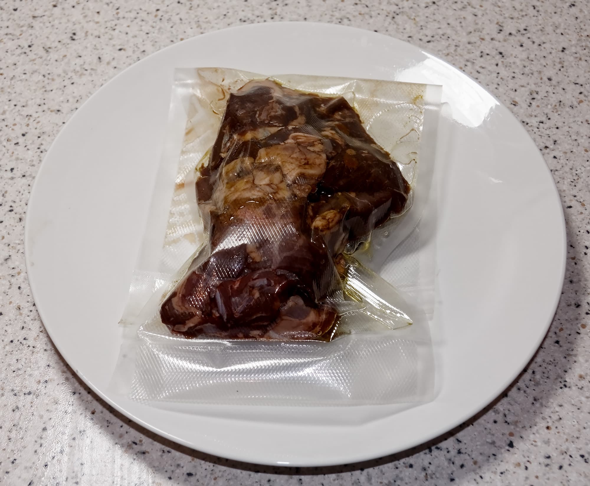 В поисках новых идей для тестов мы заглянули в морозилку, где обнаружили небольшое количество (около 500 граммов) обрезков оленьего мяса. В качестве отдельного блюда оно явно не годилось (как по внешнему виду, так и по вкусовым характеристикам — мясо было довольно жестким и жилистым), поэтому мы решили вакуумировать его и приготовить в су-виде.