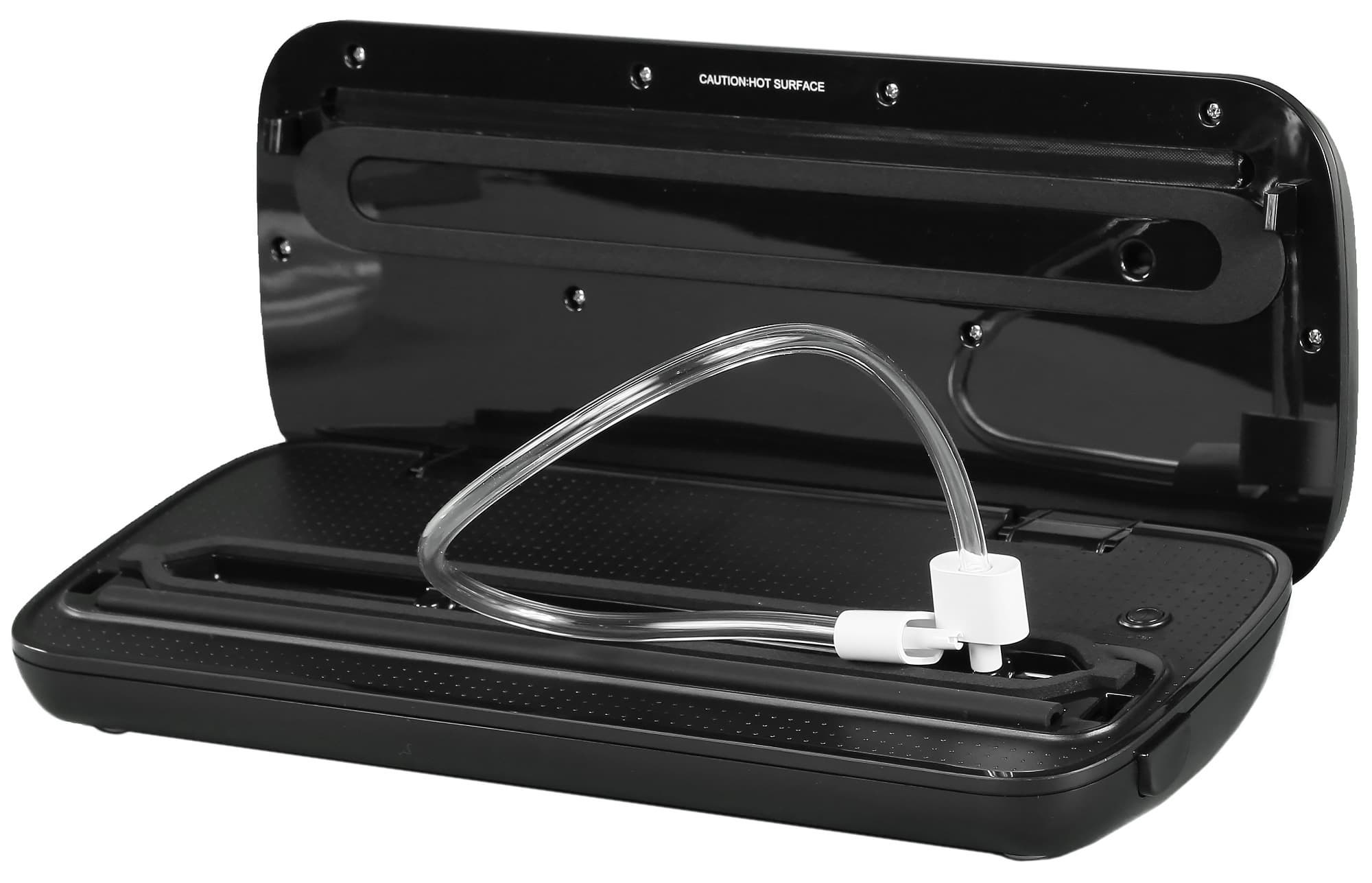 Дополнительная механическая кнопка, расположенная под крышкой устройства, позволяет вакуумировать контейнеры с помощью специального шланга-переходника. Откачка воздуха будет продолжаться до повторного нажатия кнопки.