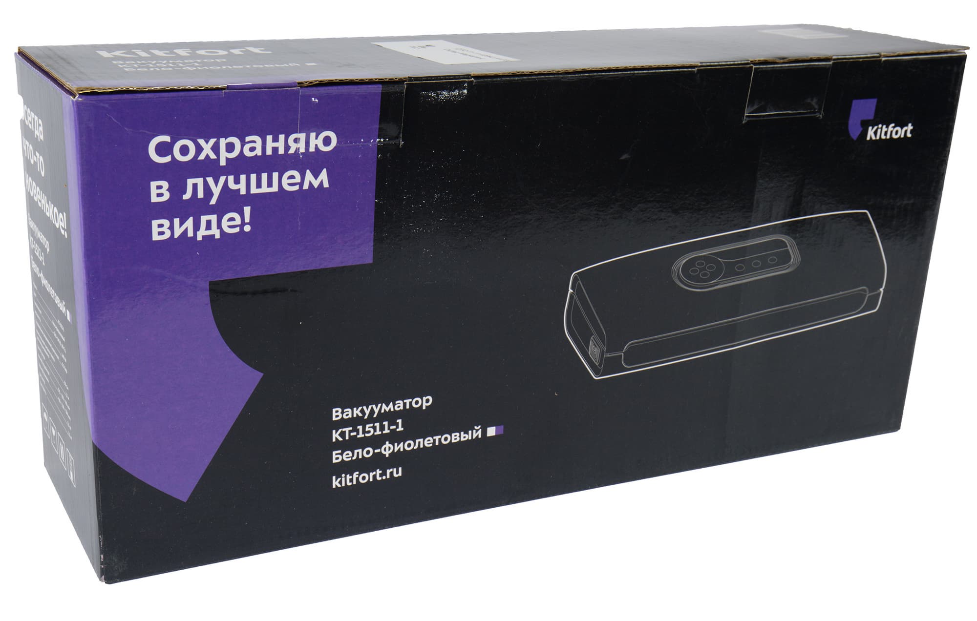 Коробка оформлена в узнаваемом стиле Kitfort: на черном фоне векторное изображение вакууматора, в левом верхнем углу — фиолетовая вставка со слоганом, намекающим на специализацию прибора. На боковых гранях коробки — список основных технических характеристик Kitfort KT-1511.