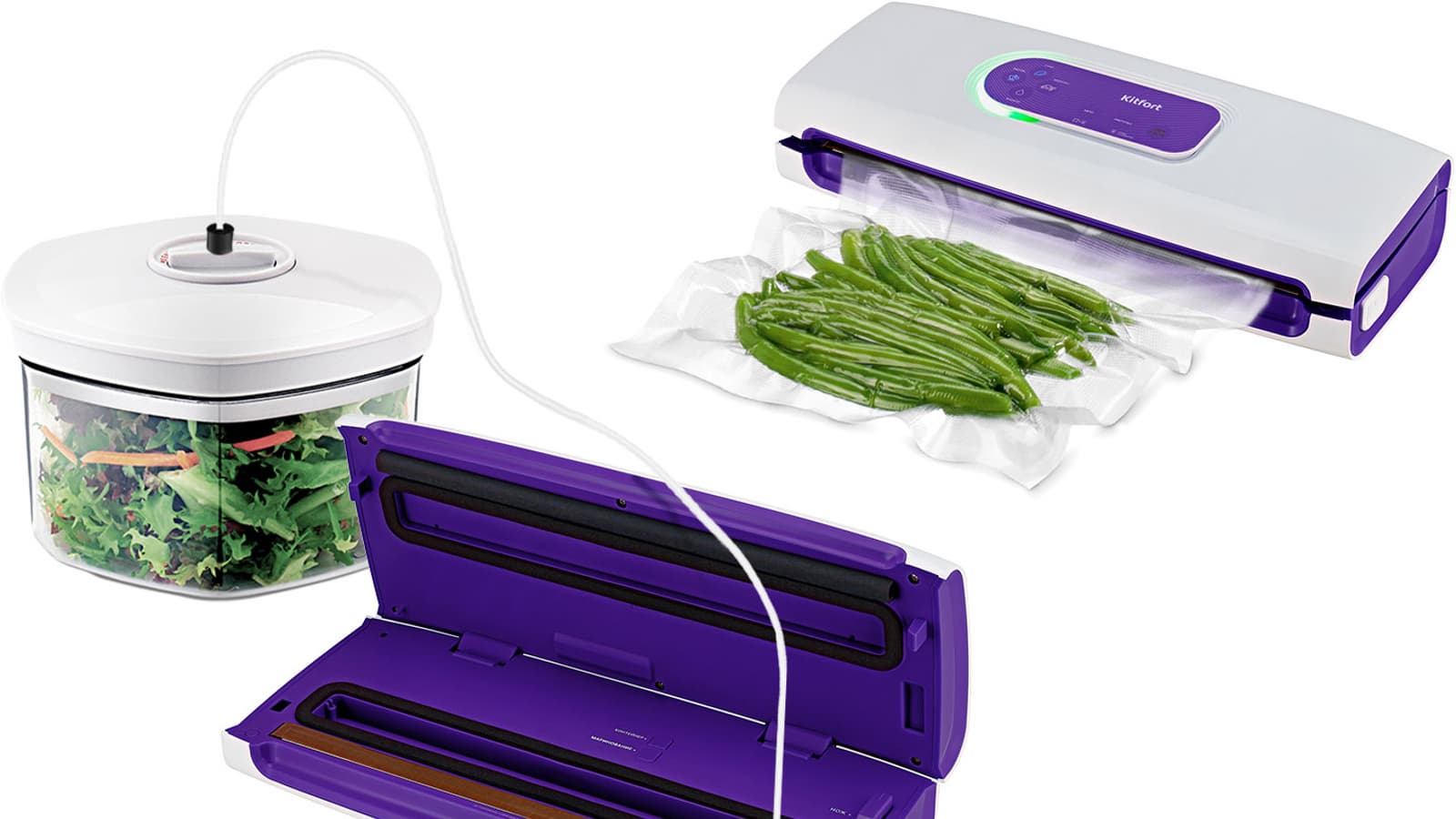 Нам очень понравилось работать с вакууматором Kitfort KT-1511. Он прост в управлении, быстро и качественно откачивает воздух из пакетов и запечатывает их идеальным широким швом. Режимы «Сухо», «Влажно», «Медленно», «Быстро» позволяют подстроиться под любой продукт. Яркий индикатор работы, у которого каждый этап обозначен своим цветом, не даст вам запутаться и открыть прибор раньше времени. Крышка легко закрывается, никак не влияя на положение пакета, так что можно не беспокоиться за качество вакуумирования. Более того, Kitfort KT-1511 умеет работать с контейнерами и мариновать в них тот же шашлык, но нам, к сожалению, не удалось проэкзаменовать его в этой дисциплине. Впрочем, никаких предпосылок к тому, что у вакууматора могут быть с этим проблемы, мы не обнаружили.