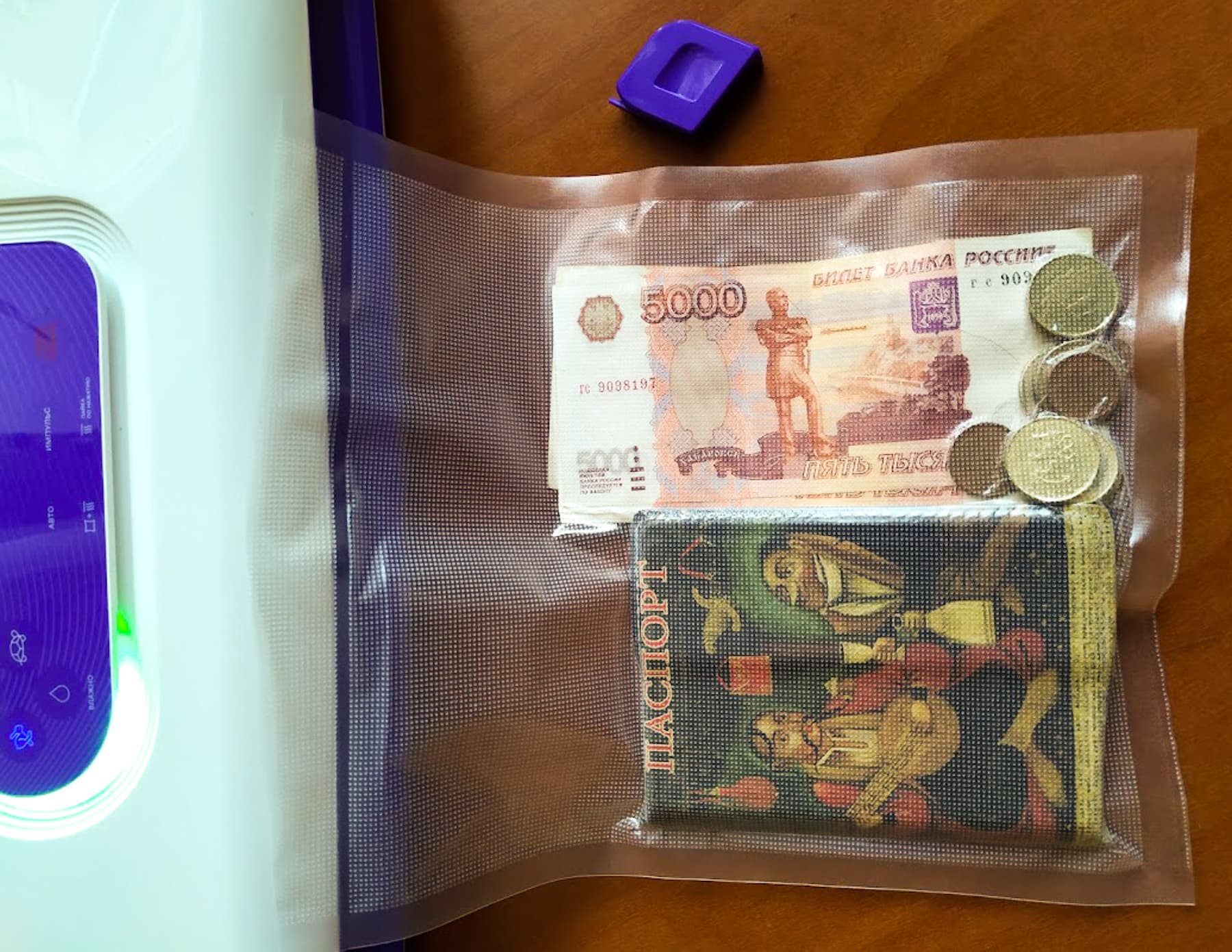 Kitfort KT-1511 упаковал важные для нас вещи быстро и качественно. Паспорт при этом так спрессовался, что им можно успешно отбиваться от неприятеля.