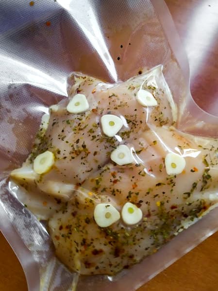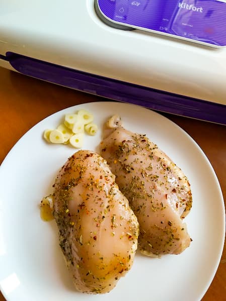 Две куриные грудки сдобрили солью, прованскими травами и прочими ароматными специями и уложили в пакет с пластинками чеснока.