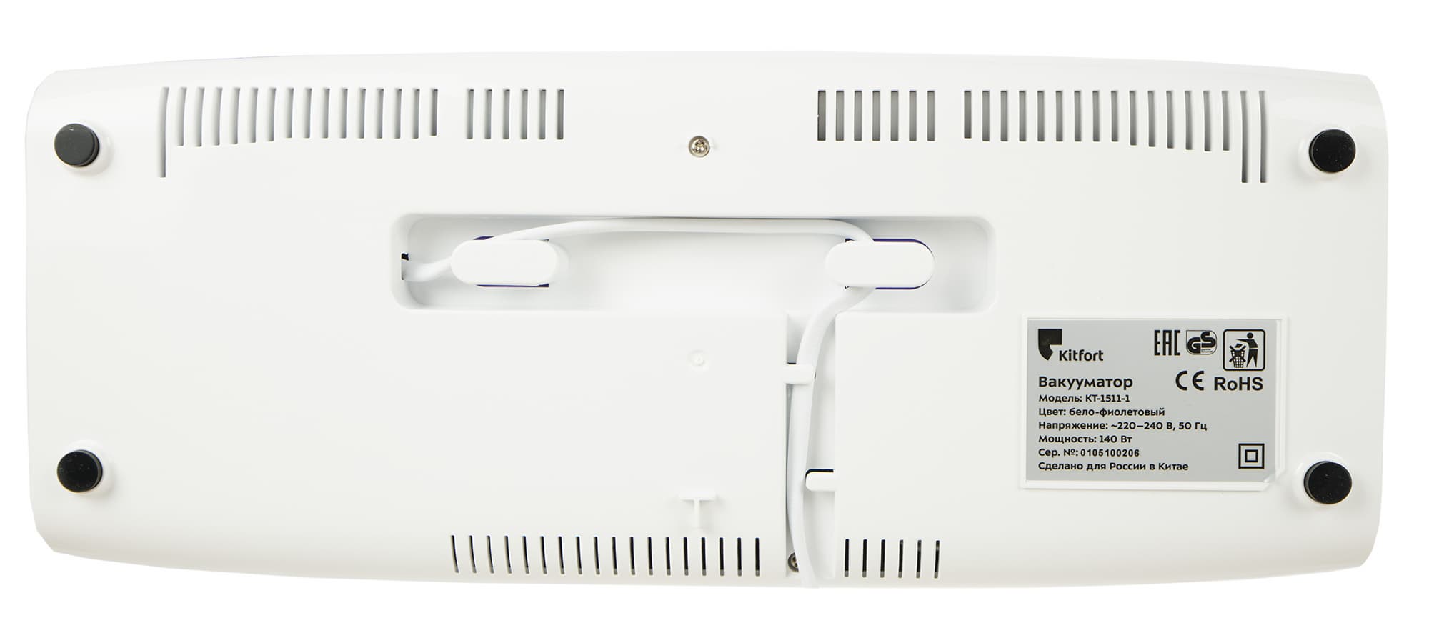 Снизу у прибора спрятались шильдик с технической информацией, вентиляционные отверстия, четыре резиновые ножки, препятствующие скольжению, и отсек для намотки электрического шнура.