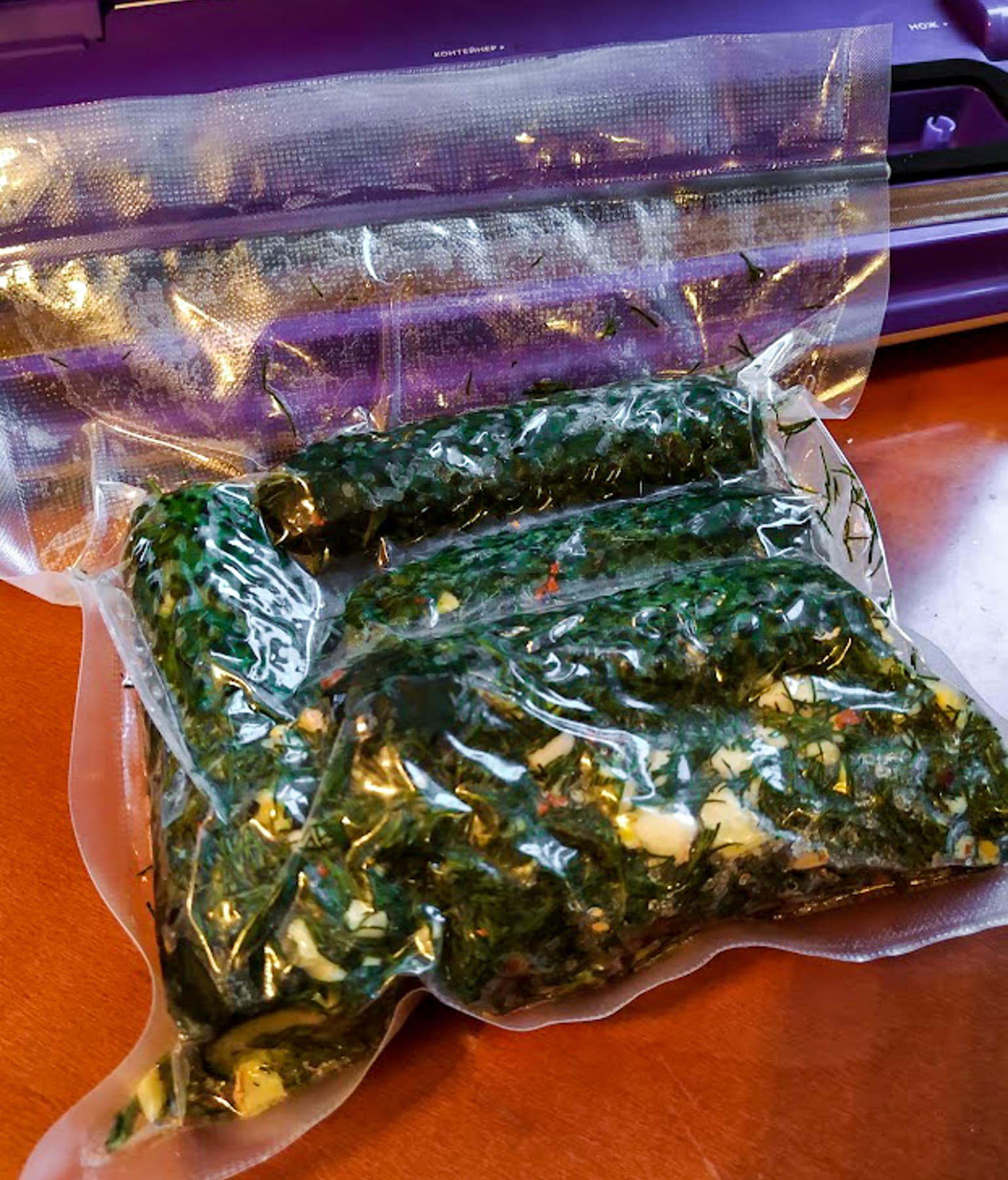 Мы выбрали режим «Медленно/Влажно», и все-таки огуречный сок во время откачки воздуха устремился к краю пакета. Но несмотря на это шов запаялся идеально.