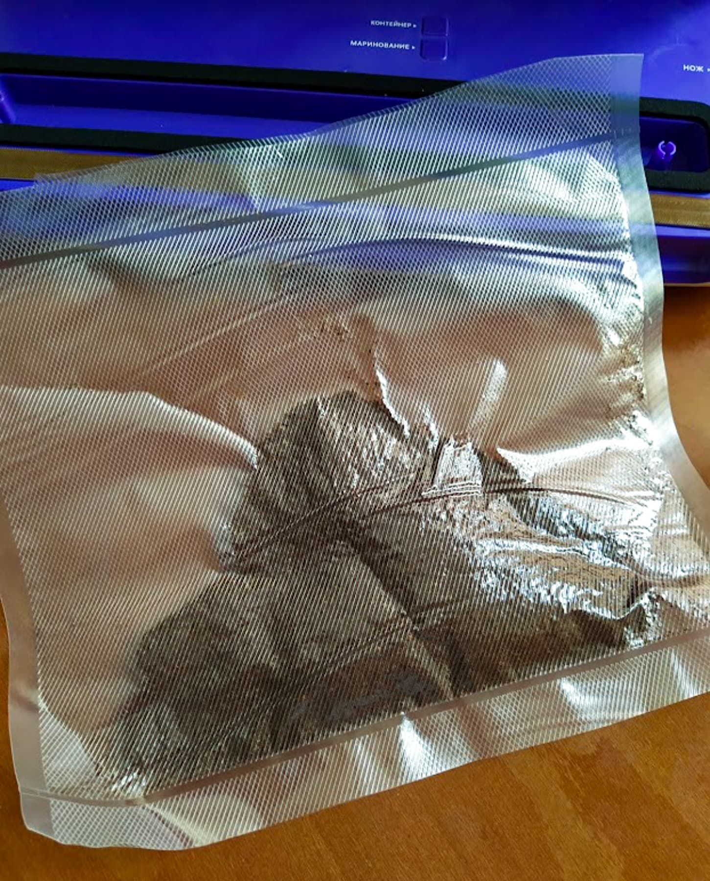Вакуумировали в автоматическом режиме, «медленно/влажно». Процесс занял 36 секунд, включая запаивание шва. Влага от курицы не успела подняться и на тройку сантиметров, пакет плотно облегает содержимое.