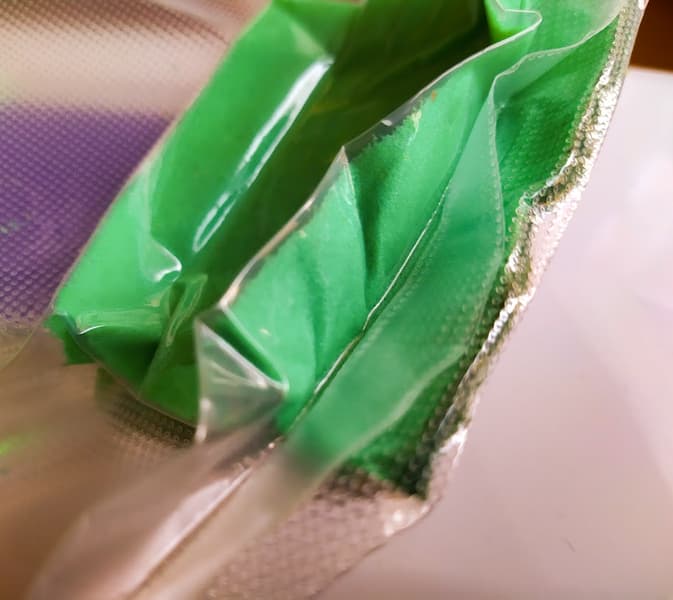 Воздух в режиме «Сухо/Быстро» откачивался 15 секунд, еще 10 секунд ушло на запаивание шва. Губка стала совершенно плоской, как будто мы завакуумировали кусочек тонкой зеленой материи на плотной подложке.