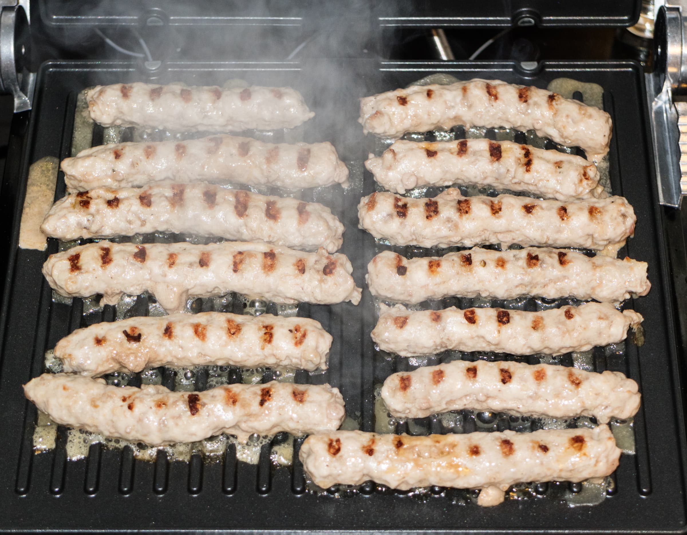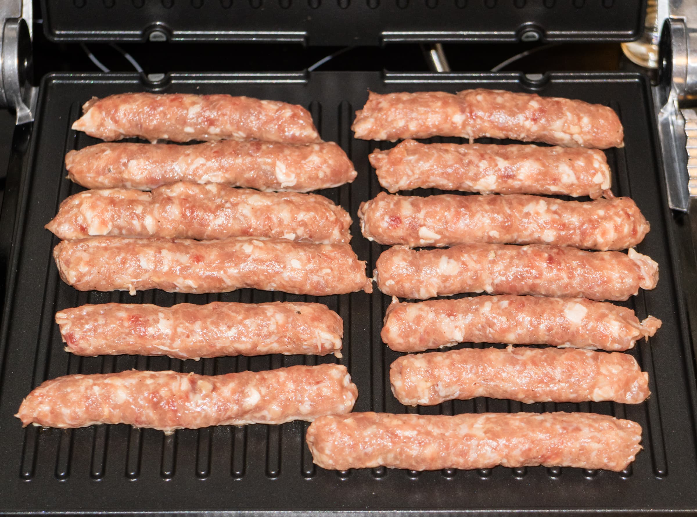 Готовили котлеты из фарша домашнего, т. е. смеси свиного и говяжьего фарша, с добавлением молока, лука, соли и перца. Фарш хорошо вымешали, отбили, затем с помощью насадки для производства сосисок надавили тонких колбасок. Установили фиксатор крышки на I, чтобы не расплющить наши длинные то ли колбаски, то ли котлетки. Установили термостат на режим 3.