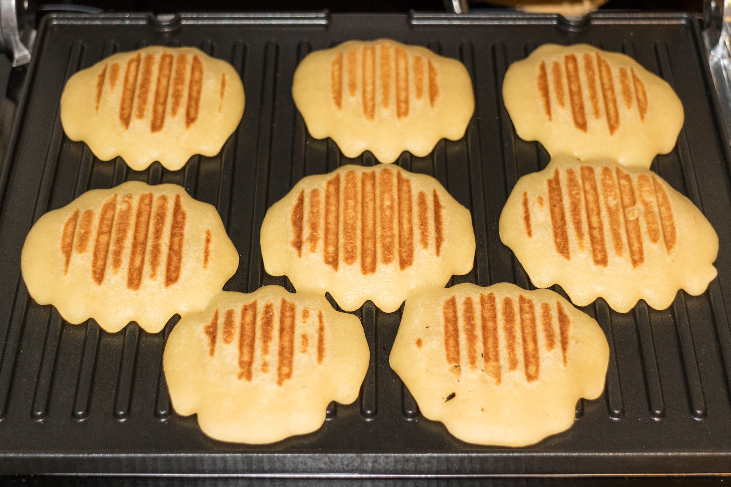 Верхняя сторона оладий выглядела не очень привлекательно: при том, что блюдо было готово, часть оладий, не соприкасающаяся с жарочной панелью, была бледной. При подаче оладьи достаточно просто перевернуть и/или посыпать сахарной пудрой.