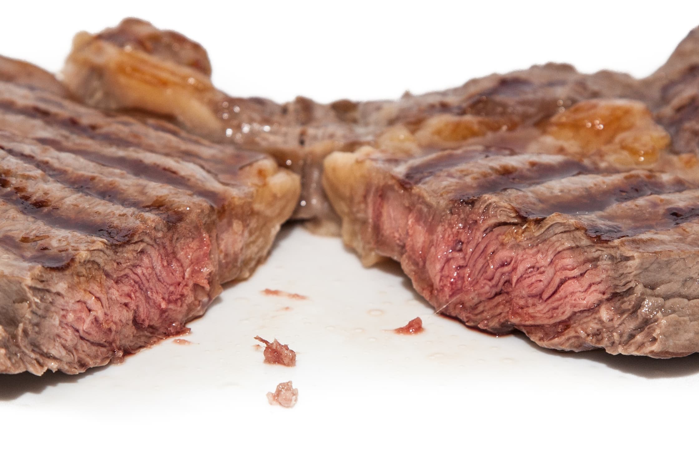 После тепловой обработки в течение 6 минут мы получили стейк средней прожарки: мясо хорошо схватилось снаружи, оставшись розовым внутри, выделяющийся сок был прозрачным.