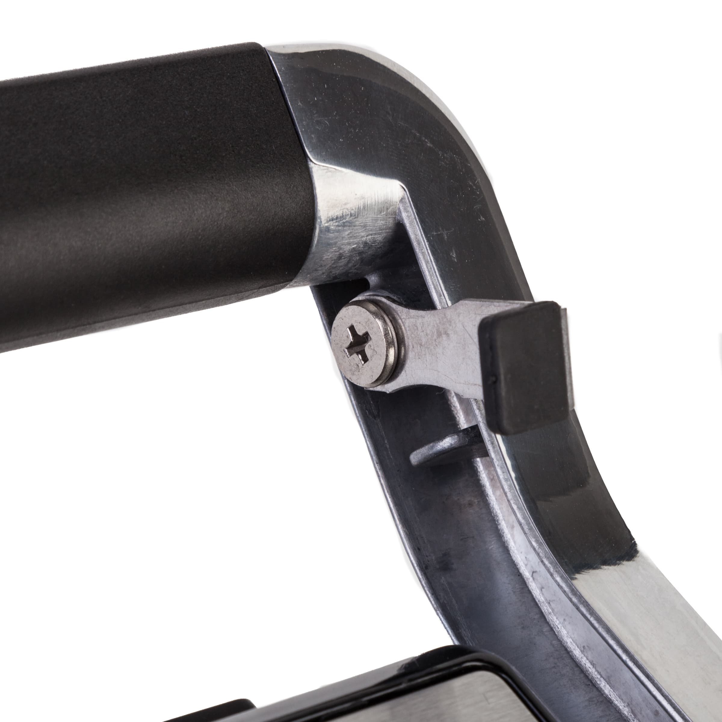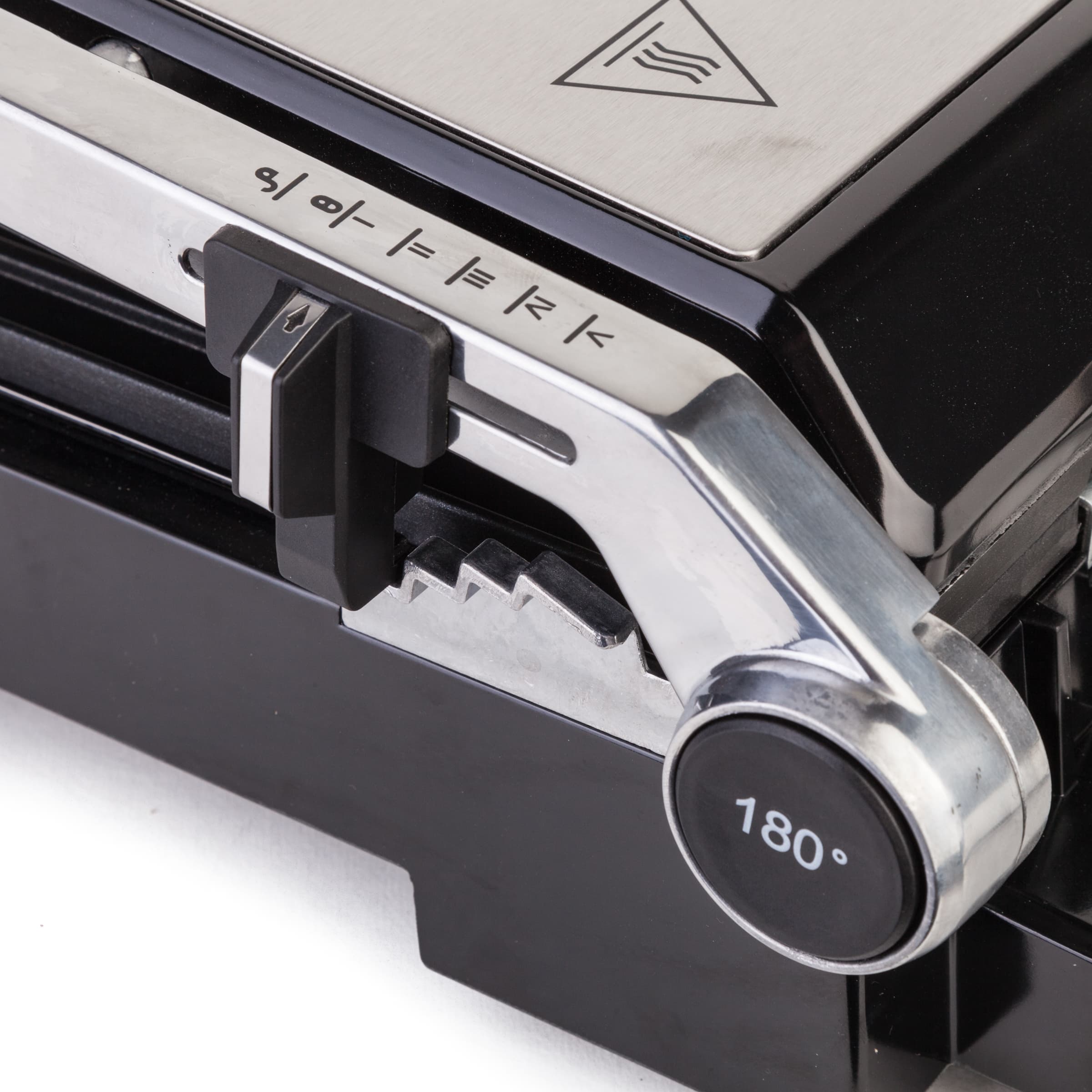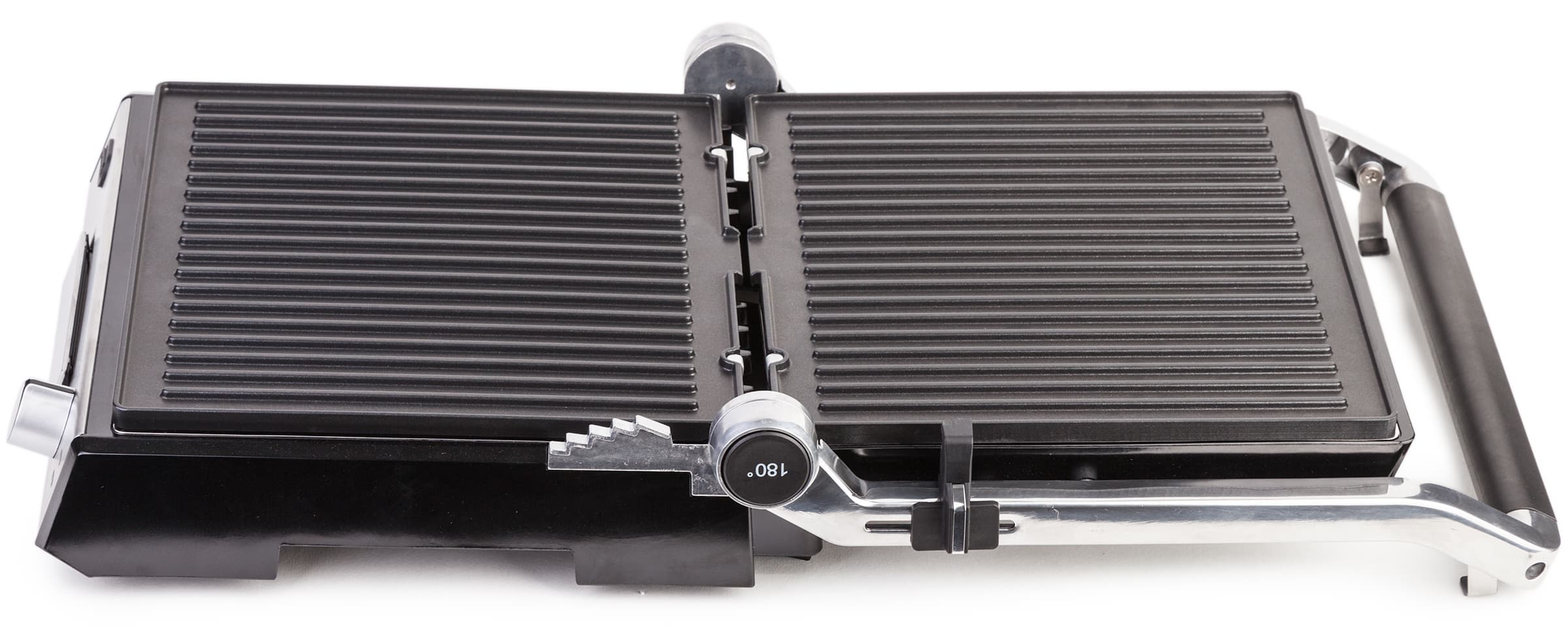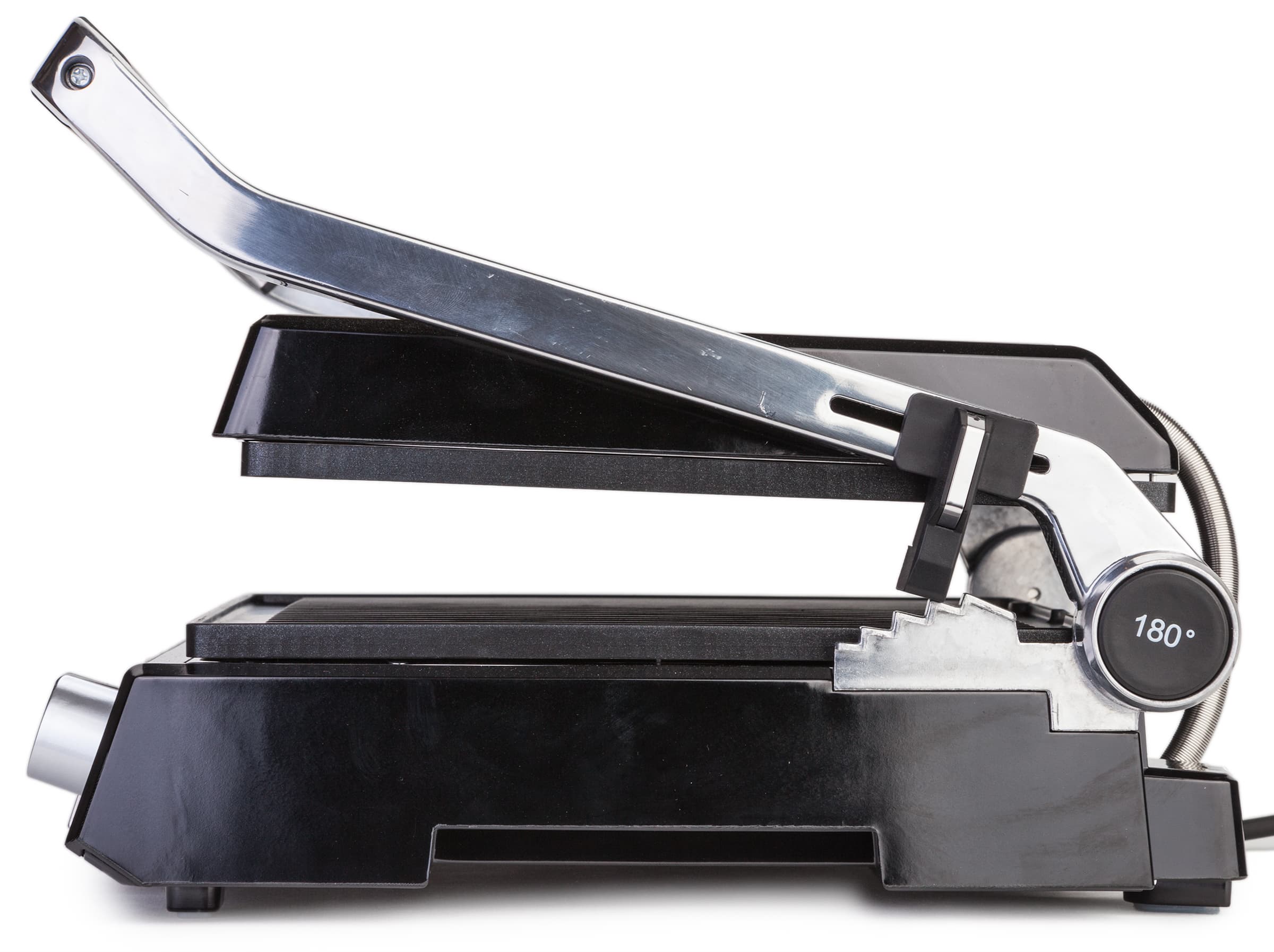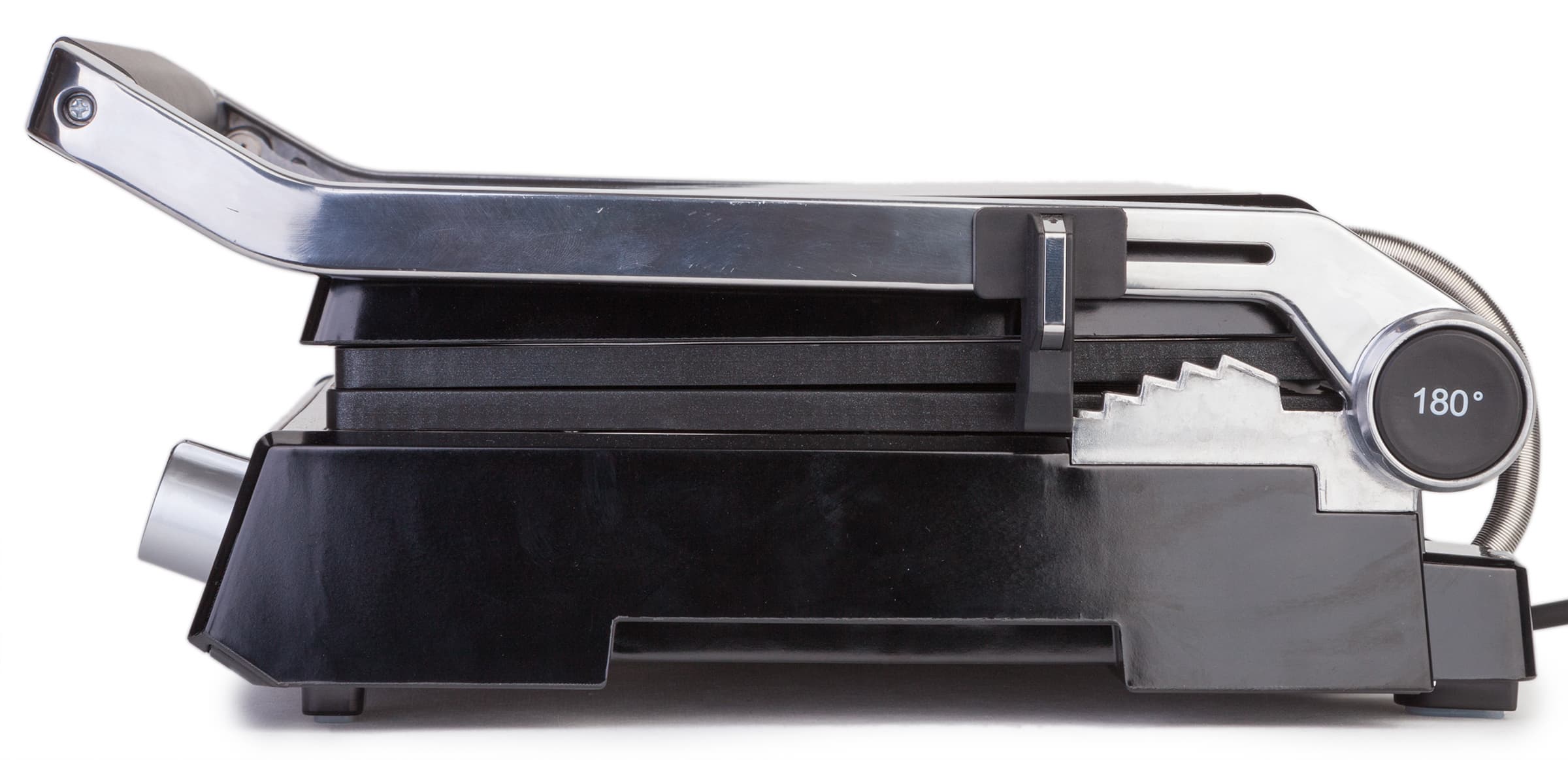 С правой стороны ручки имеются отметки в виде пиктограмм открытого и закрытого замка и римских цифр от I до V, а также небольшой фиксатор. С этой же стороны на сгибе выделяется кнопка с надписью «180°», используя которую, можно разложить гриль для работы в одностороннем режиме.
