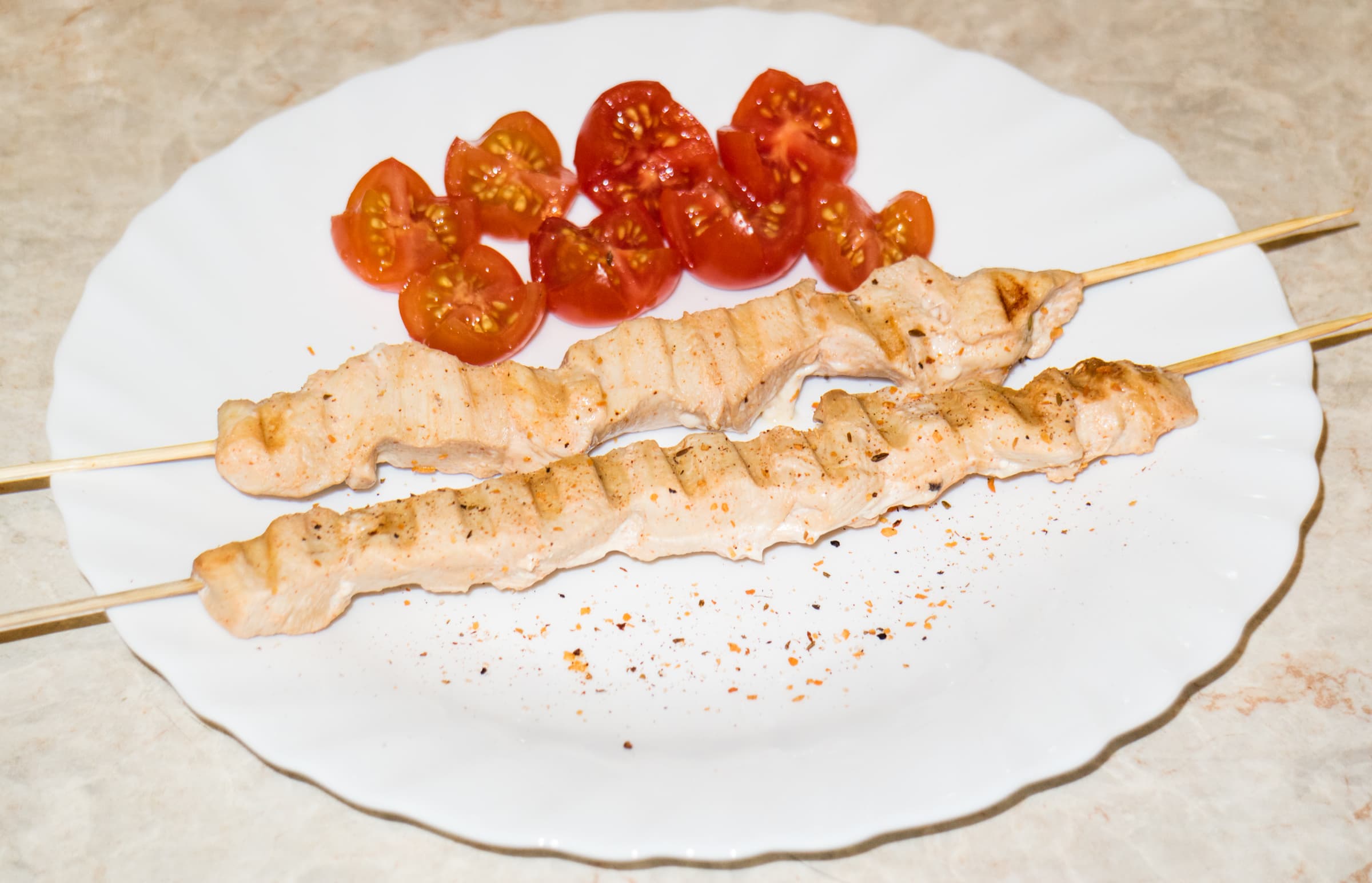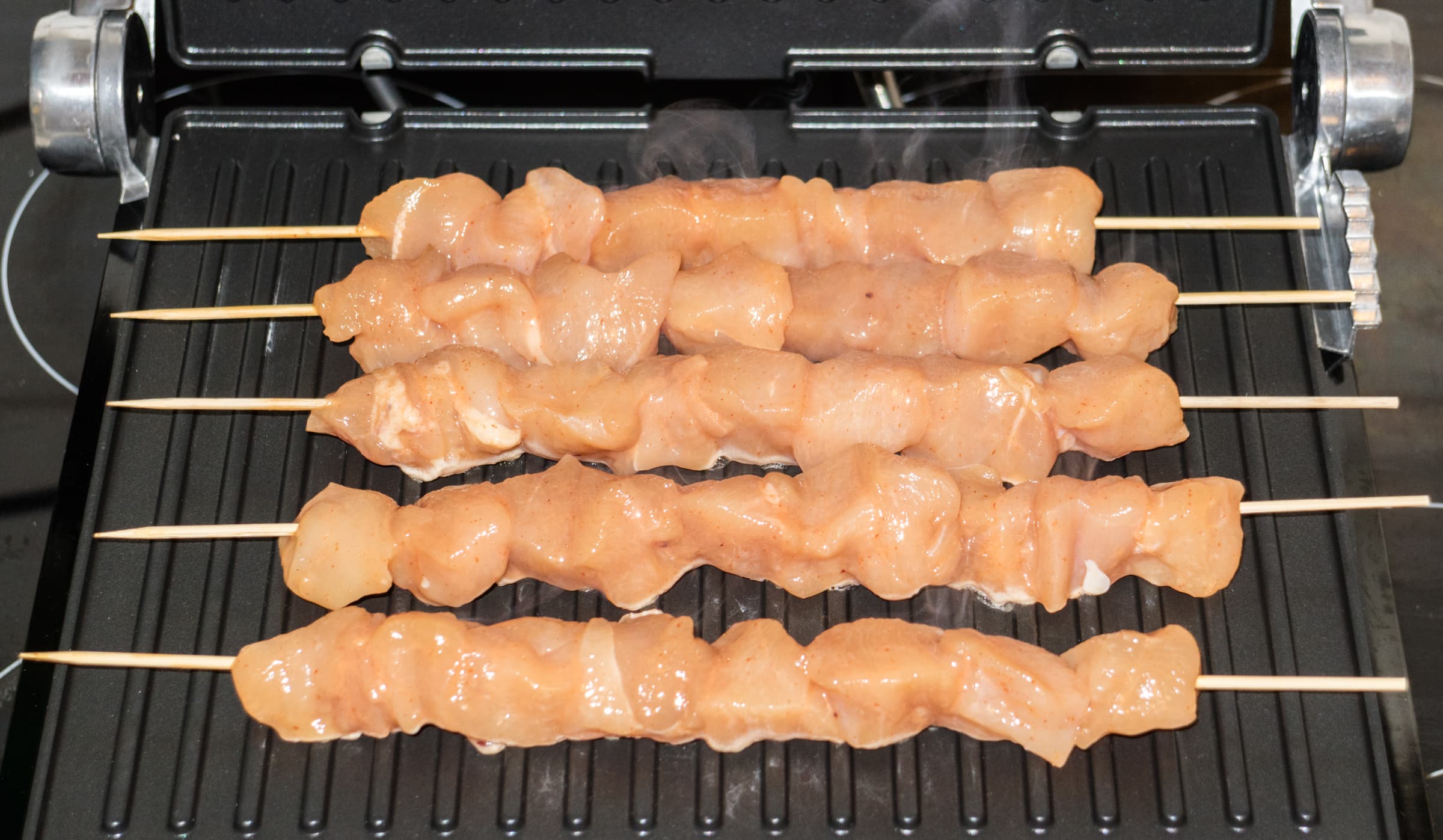 Кусочки куриного филе были замаринованы в смеси соевого соуса, имбиря, горчицы и меда. Продукт лежал в маринаде около часа. Затем мы нанизали кусочки на деревянные шпажки и расположили на панели гриля на 2-м температурном режиме.