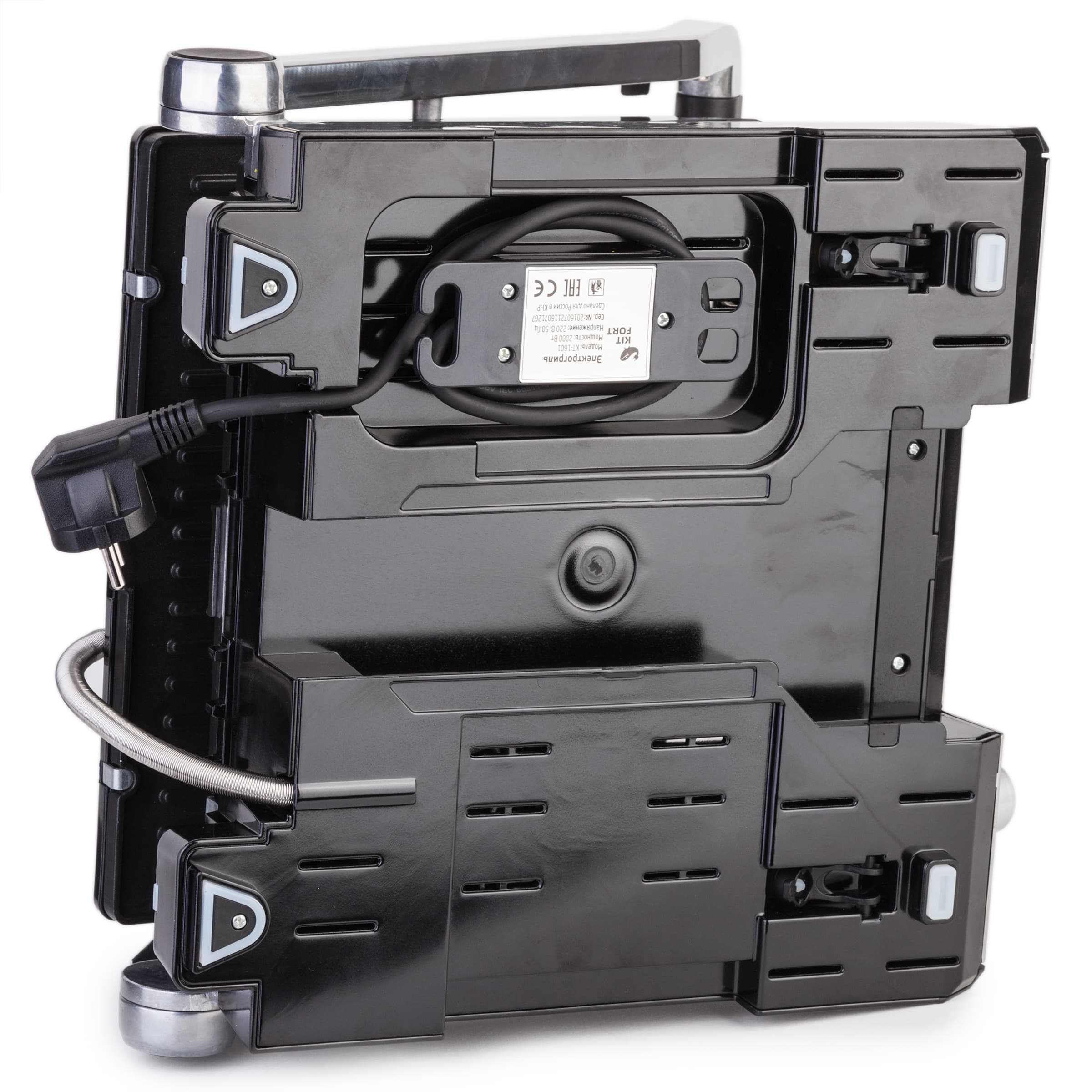 С нижней стороны устройство оснащено четырьмя ножками с силиконовыми вкладками, которые обеспечивают лучшее сцепление с поверхностью стола и противодействуют скольжению. Высота ножек около 1 сантиметра. Высота передних ножек может быть увеличена. Думаем, эта функция будет востребована при жарке особо влажных или жирных продуктов, чтобы облегчить удаление влаги с жарочных панелей в контейнер.