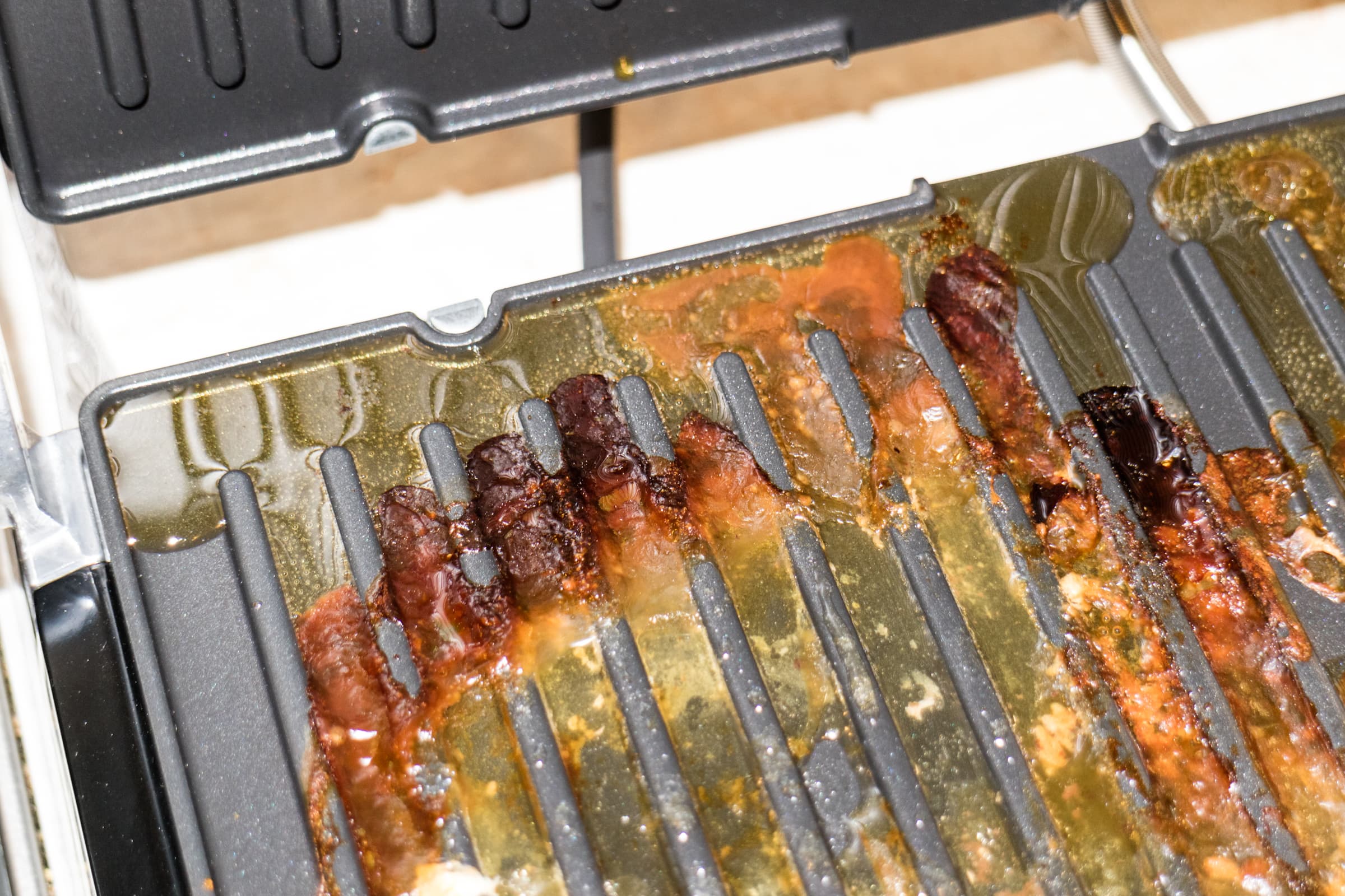 За время обжарки трех порций крыльев на нижней жарочной панели скопилось довольно внушительное количество жира. Бо́льшая его часть стекала в поддон, но на самой панели остающаяся жидкость выглядела устрашающе. Нам казалось, что жир вот-вот перельется через край и зальет внутреннюю часть гриля и нагревательный элемент. Однако, несмотря на наши страхи, этого не произошло: жидкость дисциплинированно стекала в предназначенный для этого поддон.