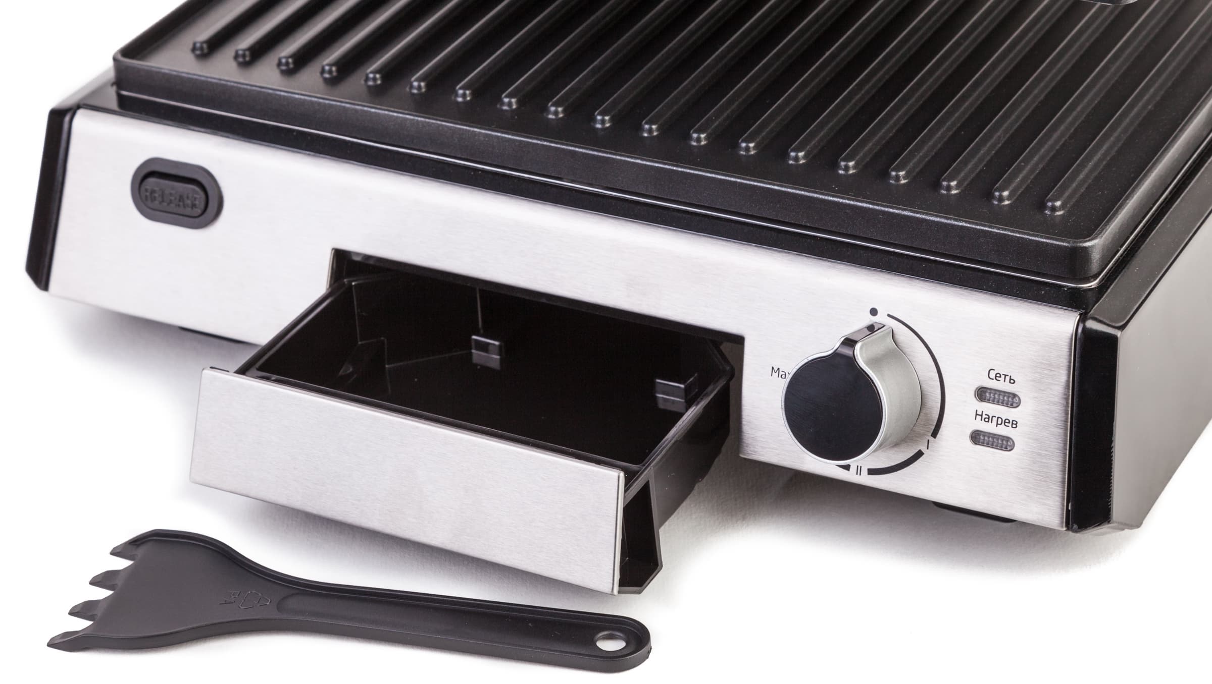 | Аксессуары | две съемные пластины с антипригарным покрытием, поддон для сбора жира и жидкости, лопатка |