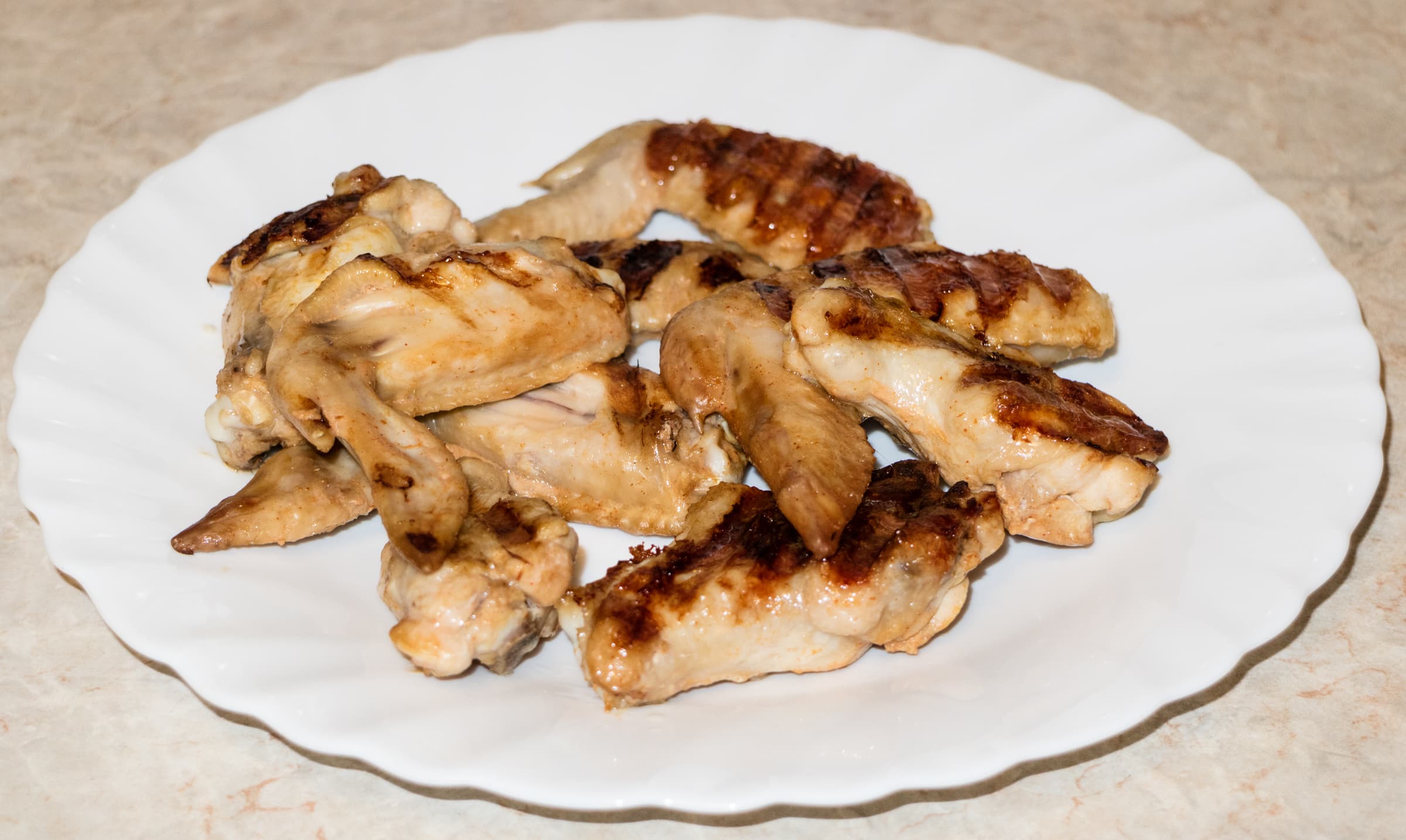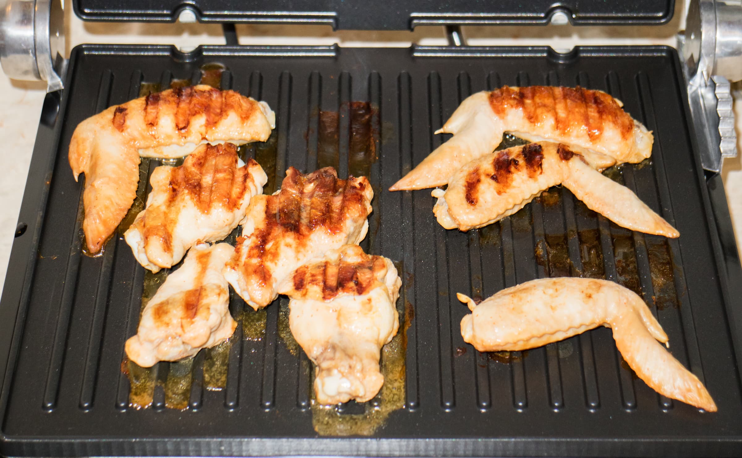 Крылья были вымыты и замаринованы с солью, специями и острым соусом на сутки. Установили гриль в положение двухсторонней обжарки, т. е. когда панели контактируют с продуктом. Обработку производили на втором температурном режиме в течение 15 минут. Курица оказалась совершенно готова, прожарена и изнутри, и снаружи.