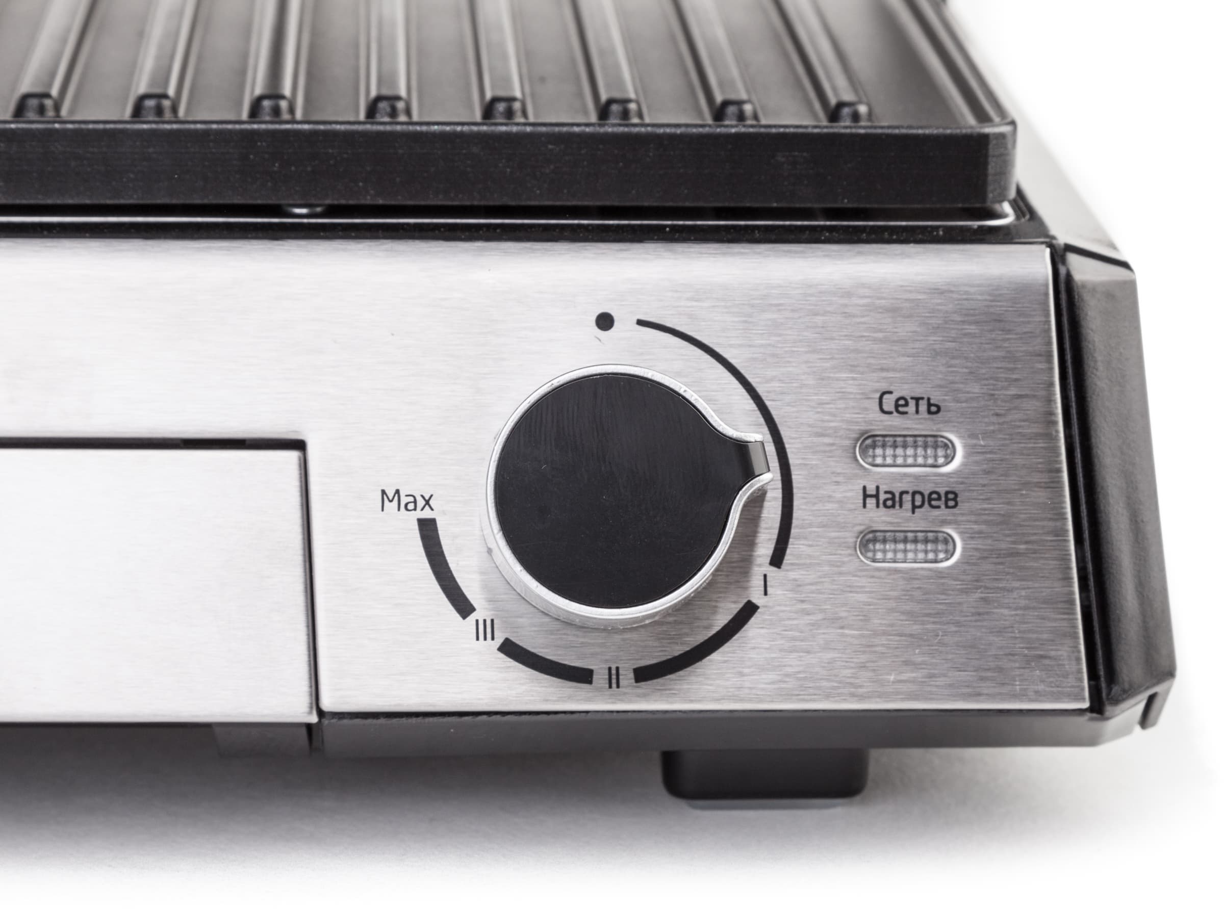 Панель управления расположена в правой передней части гриля и представляет собой термостат и два индикатора: питания и температуры. Управление прибором интуитивно и не требует наличия особых навыков или прохождения обучения.