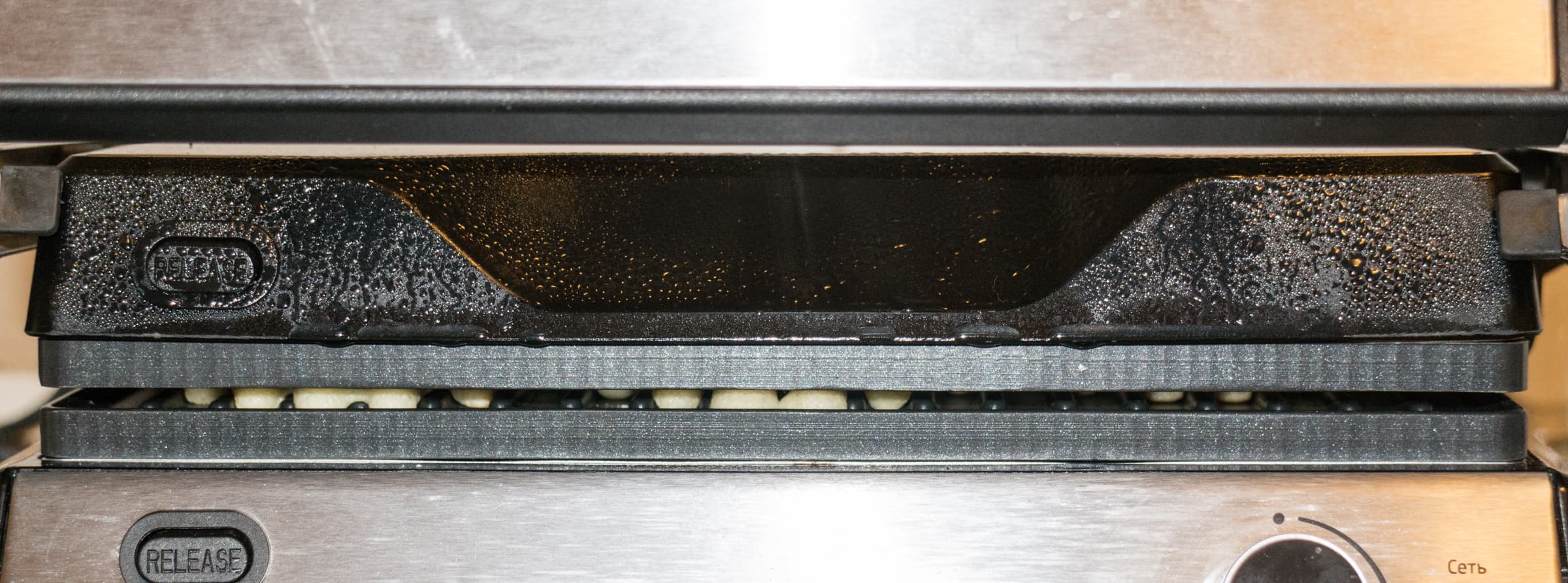 Мы не беремся предсказывать, как это отразится на дальнейшей эксплуатации прибора и скажется ли на его долговечности. В принципе, гриль отличается качественной сборкой, так что вероятность того, что влага попадет во внутреннюю часть корпуса, минимальна. Однако мы предпочли периодически промокать скапливающуюся влагу сухой салфеткой.