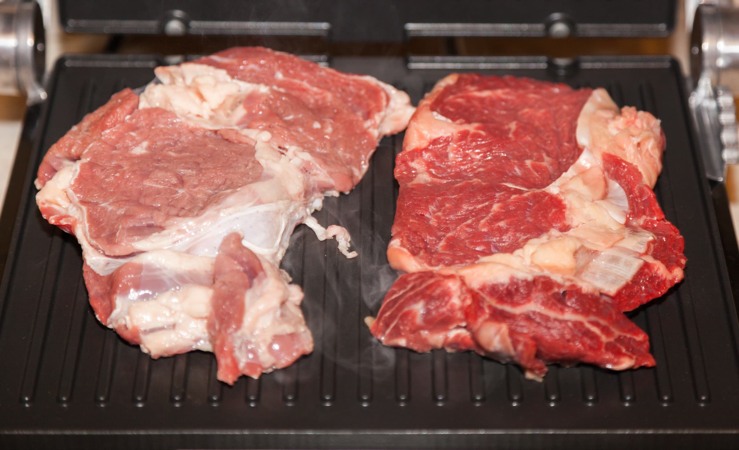 Пожалуй, это первый гриль, тестирование которого мы начали с самого ответственного эксперимента. Тонкий край был разделан на стейки толщиной около 2,5-3 см, затем кусочки были помещены в гриль на максимум температуры.
