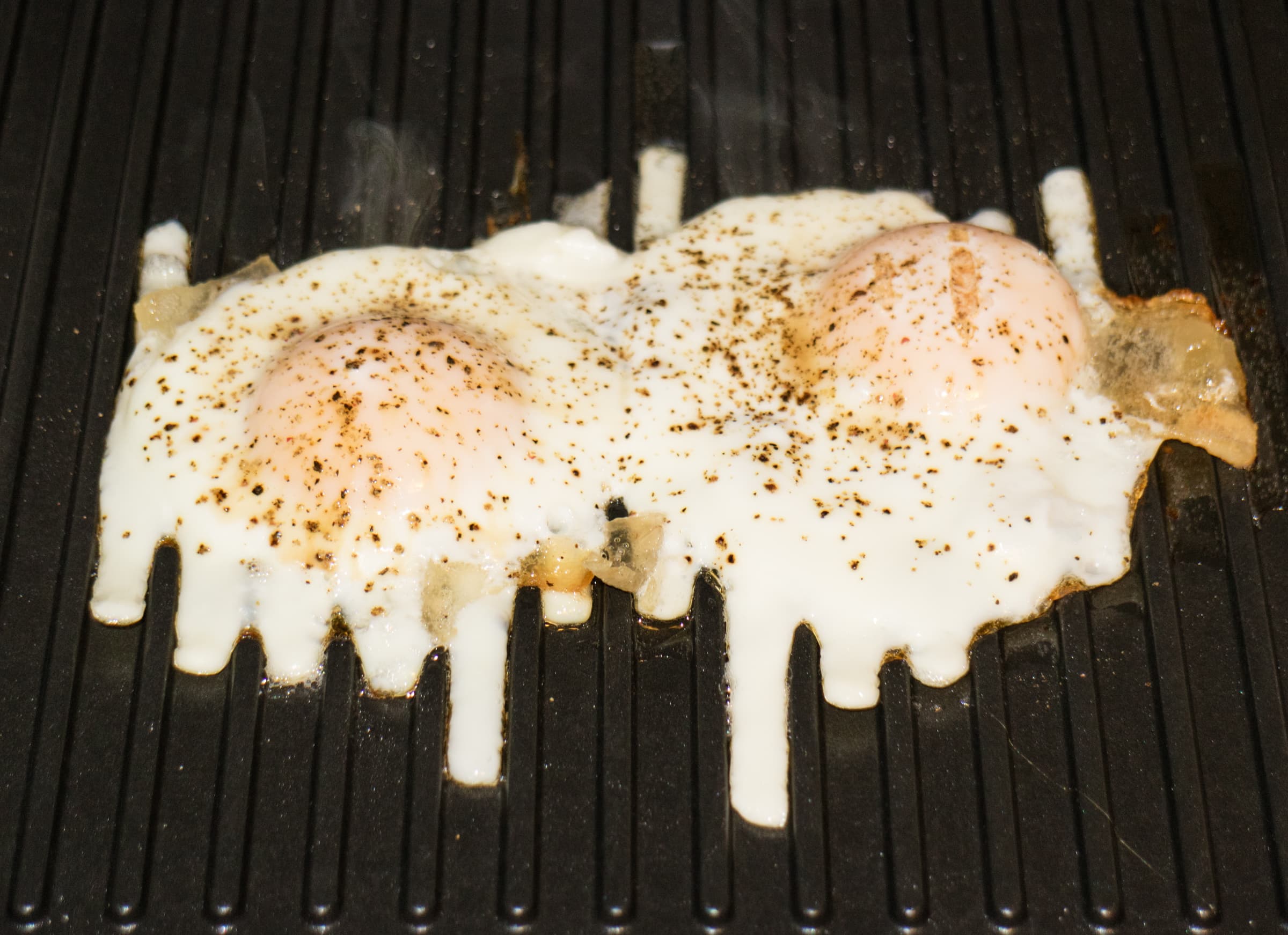 Тонко нарезали несколько кусочков сала, слегка их поджарили на открытом гриле, затем вбили поверх два яйца, установив фиксатор на режим I приоткрытой крышки. Мы надеялись, что температуры будет достаточно для того, чтобы белок не сильно растекался по поверхности рифленой панели, и оказались правы: жидкое яйцо не растеклось. За довольно короткое время белок схватился, а желток при этом подогрелся, но остался жидким.