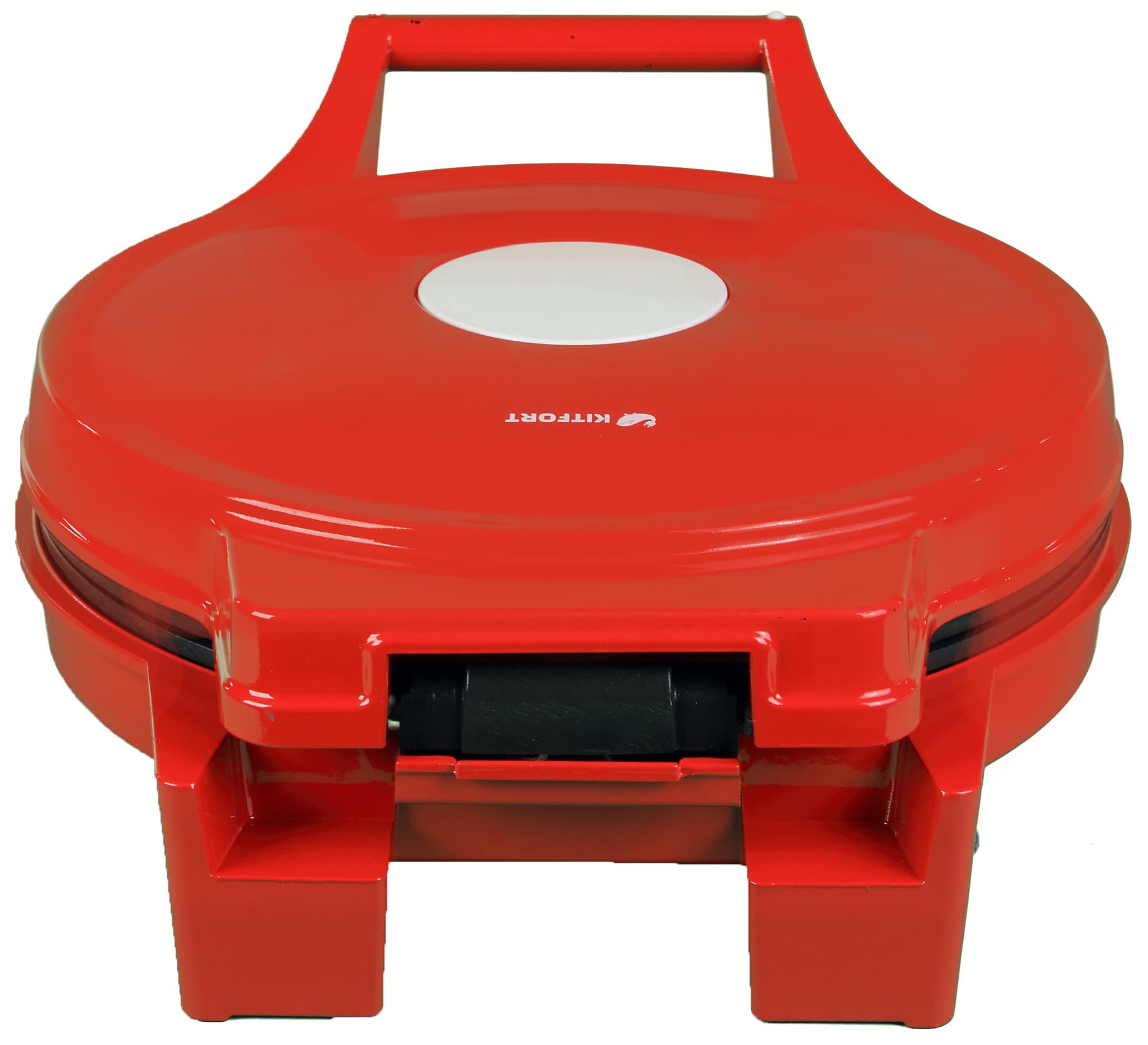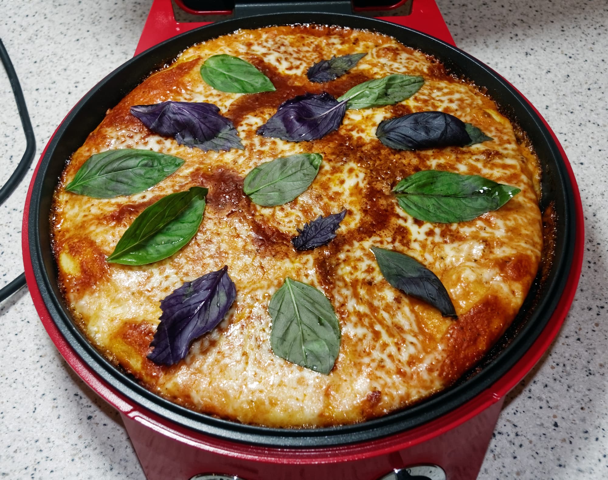 Визуально пиццамейкер выглядит как симпатичный прибор из средней ценовой категории. Корпус сделан из металла, окрашенного в ярко-красный цвет. Снизу можно увидеть резиновые противоскользящие ножки и нехитрое устройство, позволяющее смотать излишек провода.
