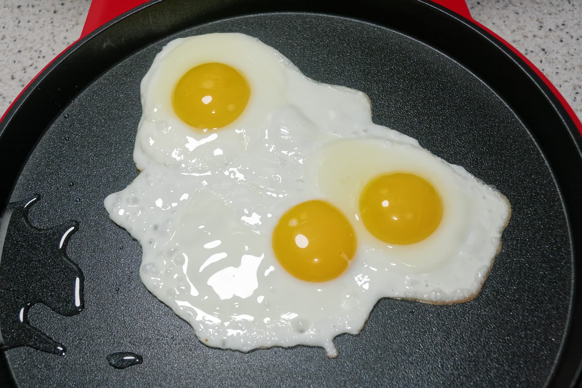 Яичница была готова примерно через 3,5 минуты. За это время белки успели свернуться (местами даже начала образовываться характерная корочка), а желтки остались жидкими — именно такого эффекта мы и хотели достичь.