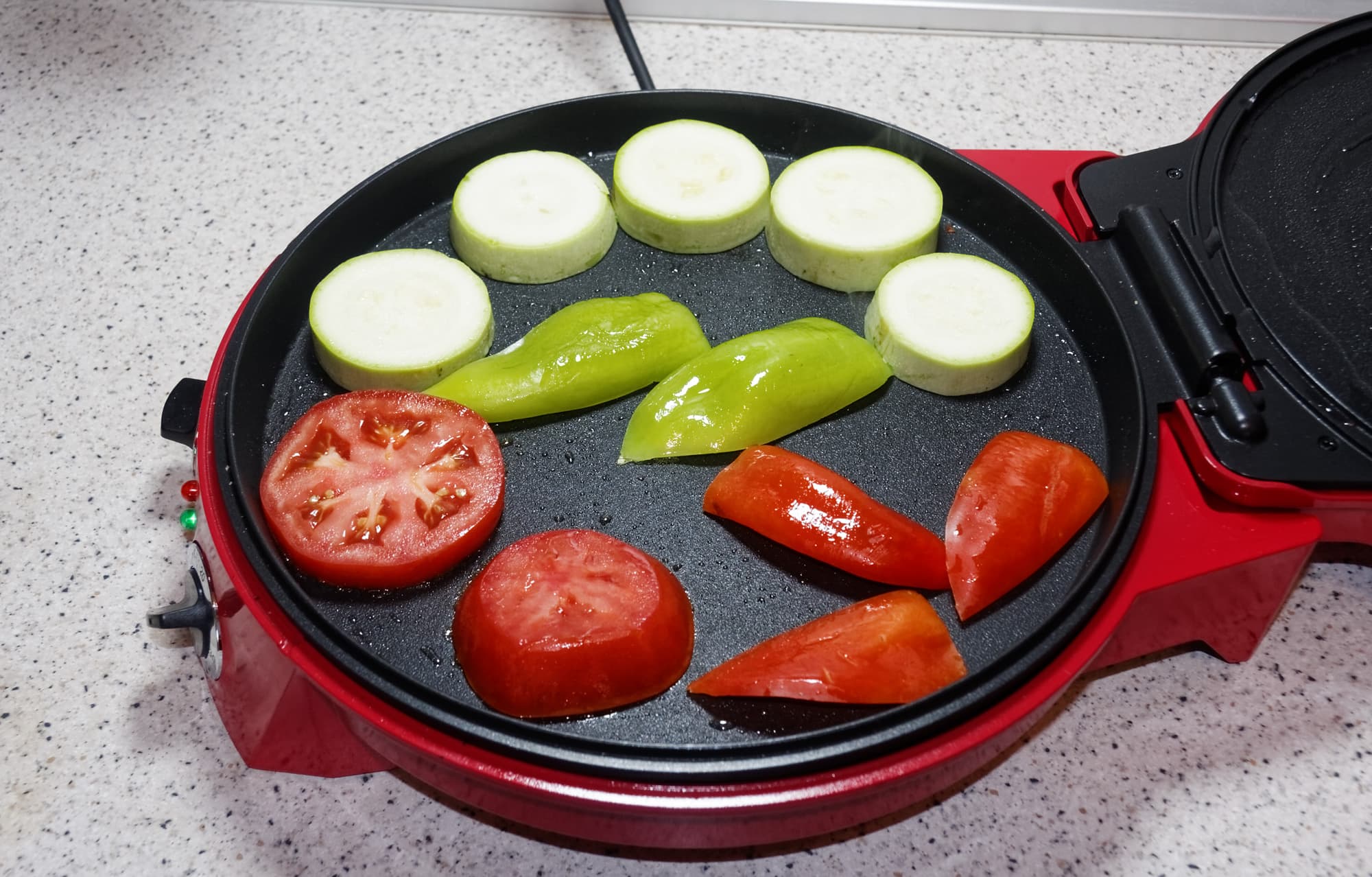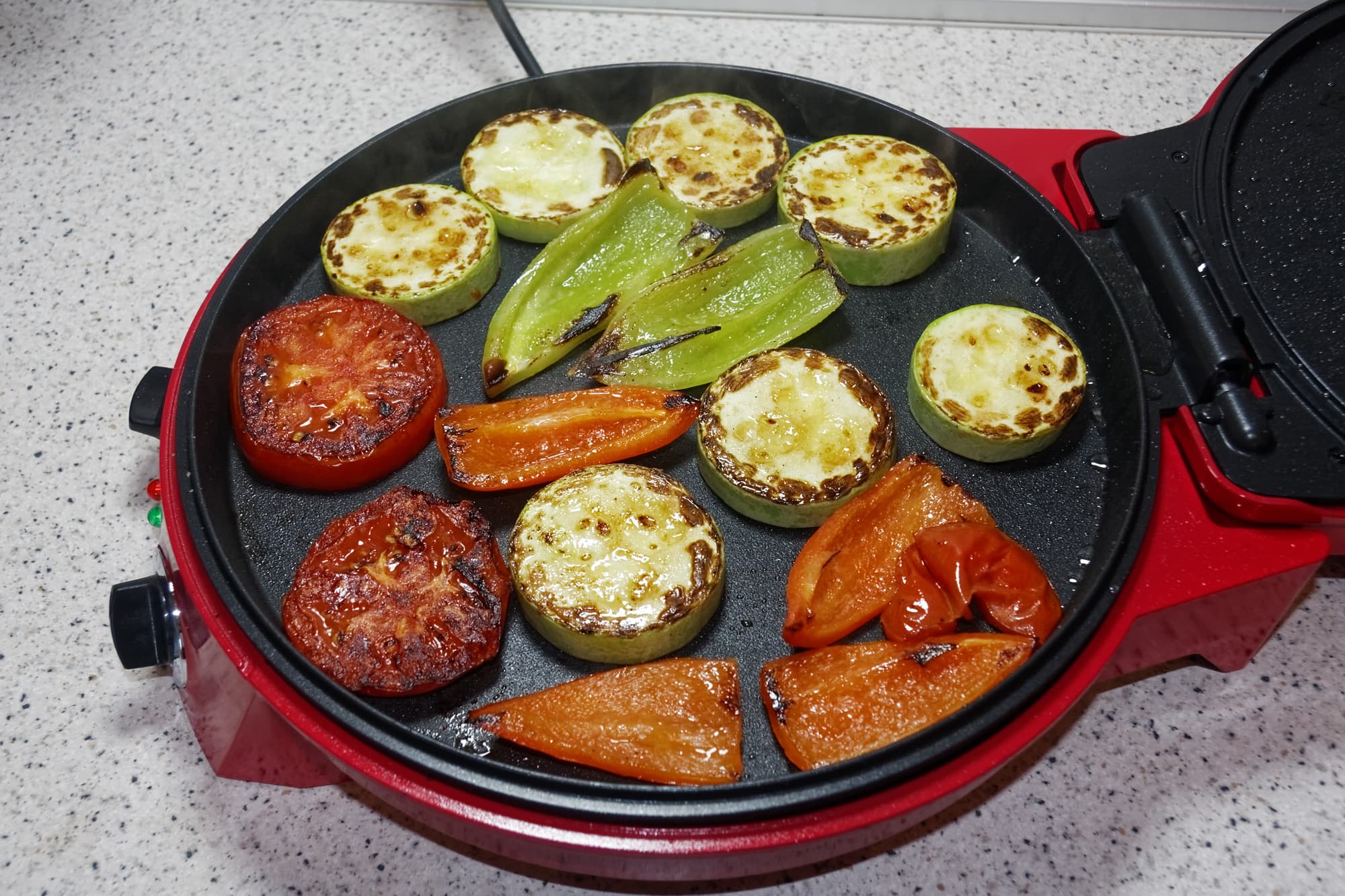 Для приготовления овощей-гриль мы разогрели пиццамейкер до максимальной температуры, добавили немного масла, выложили на основную панель овощи, слегка обжарили их в течении нескольких минут, после чего закрыли крышку и готовили овощи до появления характерных подпалин. Всего на приготовление у нас ушло 13 минут.