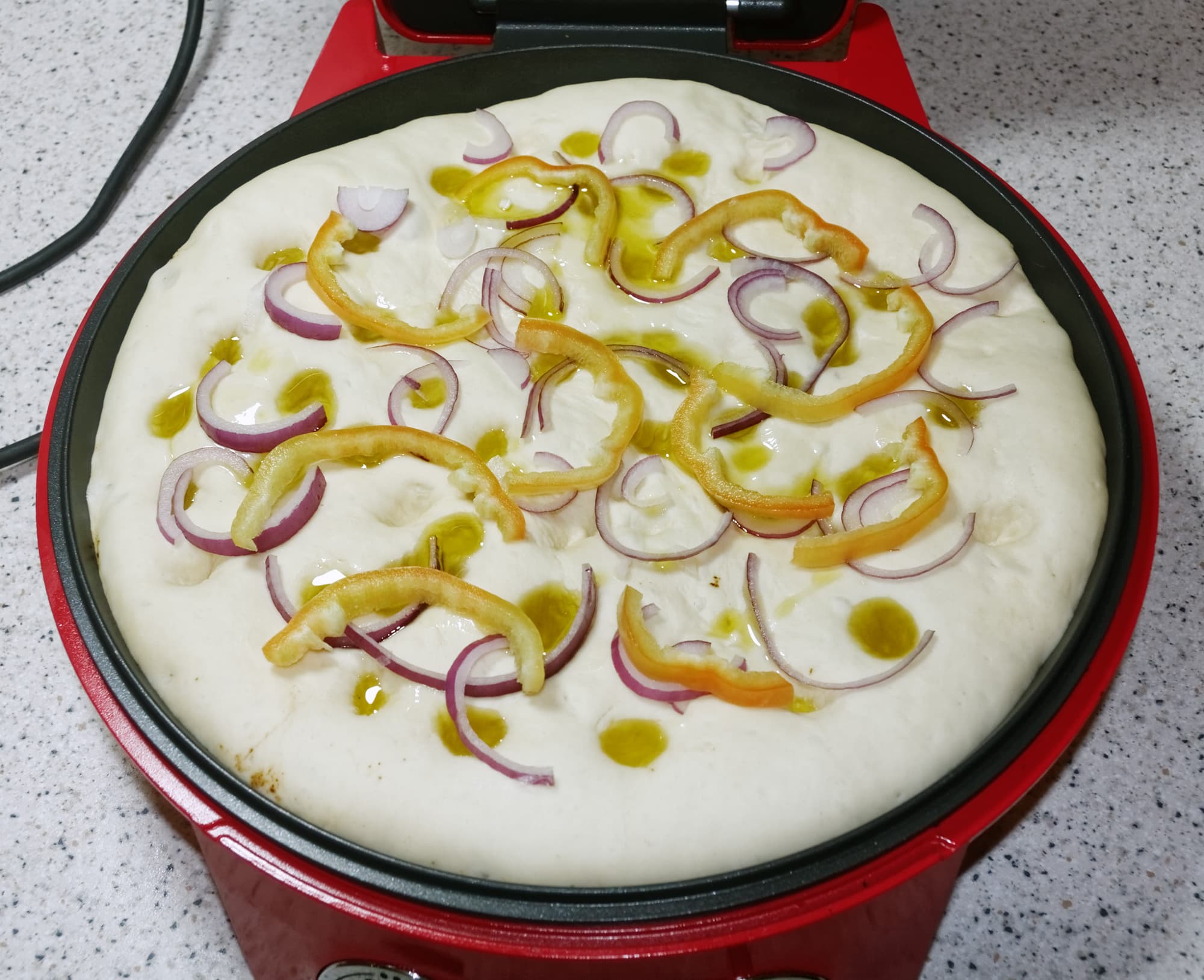 Форму для выпечки смазать оливковым маслом, тесто разделить пополам, сформировать шар и раскатать его скалкой до нужного диаметра. Поместить тесто в форму для выпечки (в нашем случае — в пиццамейкер) и оставить еще на 30 минут.