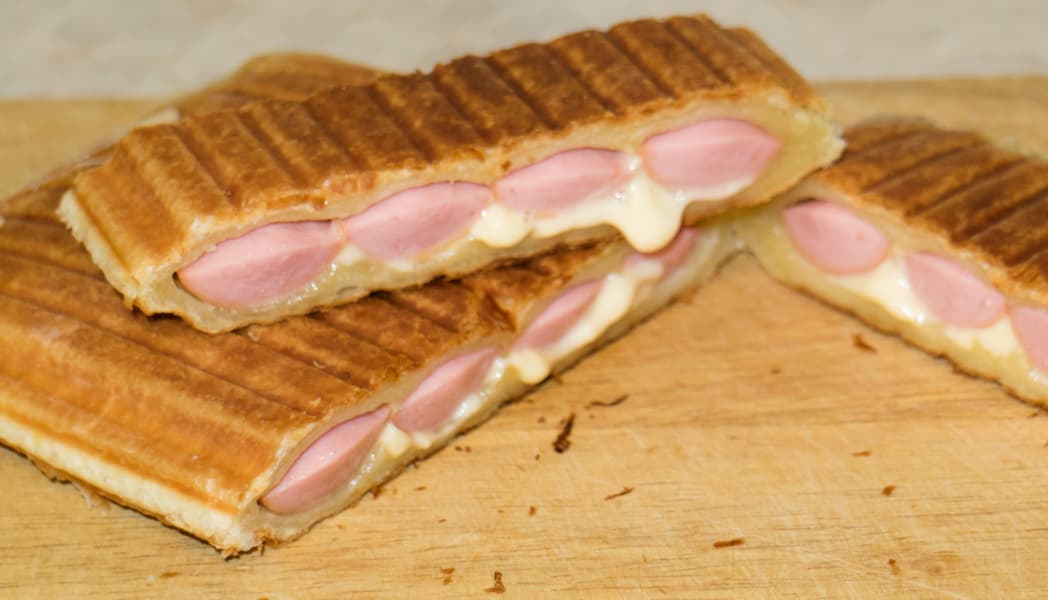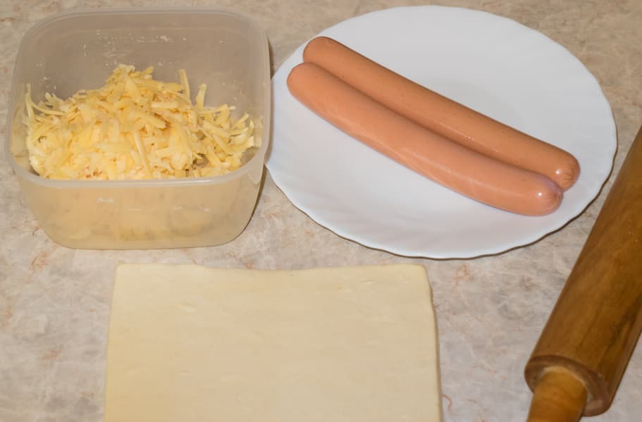 Из одной упаковки теста было решено приготовить два сытных пирога. Первый — с сосисками и сыром, второй — из курицы и сыра. Разморозили и слегка раскатали кусок теста так, чтобы в сложенном надвое виде он помещался на панель-гриль. На половину уложили нарезанные вдоль сосиски, расстояние между ними заполнили натертым сыром Эллементаль. Сложили слой теста и закрепили края.