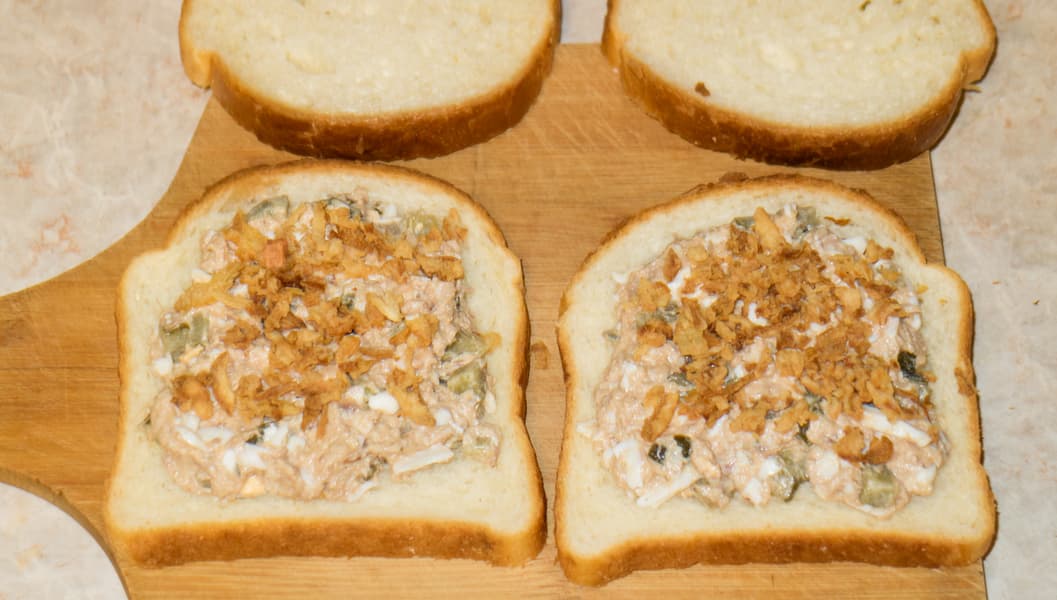 Начать мы решили с самого простого. Приготовили салат из измельченного консервированного тунца, вареного вкрутую яйца, корнишонов и майонеза. Выложили пару ложек салата на ломтик хлеба, посыпали жареным луком и прикрыли вторым ломтиком.