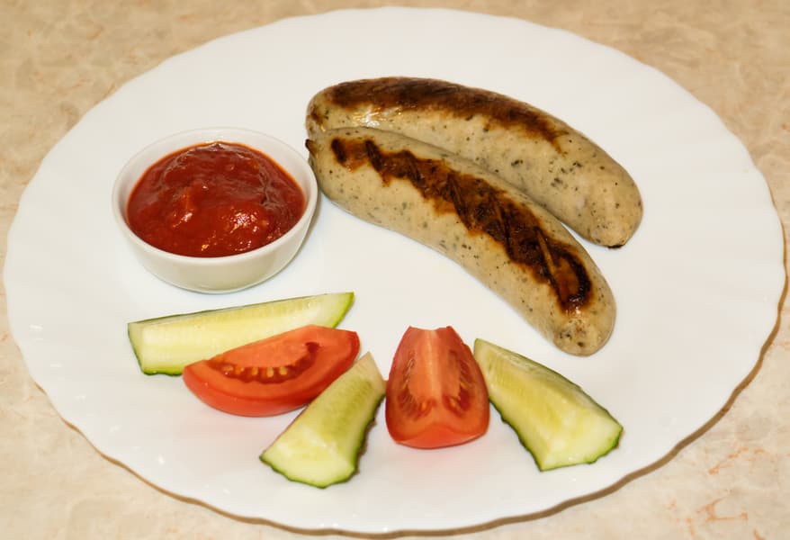 Цель данного эксперимента — проверить, возможна ли обжарка продукта такого диаметра вообще, и прогреется ли сарделька по всей толщине. Разогрели гриль до четвертого режима, уложили на панель сардельки. Опустили верхнюю панель без фиксации. Жарили около 5-6 минут, затем перевернули сардельку и оставили еще минут на 5-7. Поверхность сарделек подрумянилась, внутри они оказались очень горячими и полностью готовыми.