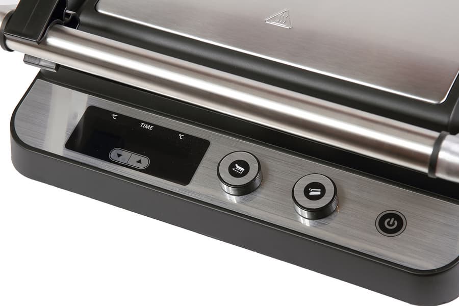 При подключении гриля к электросети раздается длительный звуковой сигнал и на дисплее на короткое время загораются и гаснут цифры. Индикатор на кнопке включения начинает мигать — гриль находится в спящем режиме. После нажатия на кнопку включения/выключения на дисплее загораются нули — прибор перешел в режим ожидания. В этом режиме нажатие на регулятор соответствующей панели включает ее нагрев. Температура задается вращением регулятора по часовой стрелке для увеличения и против часовой стрелки для уменьшения показателя. Шаг регулировки — 10 °C. Установленный показатель отображается на дисплее. Под цифрами, отображающими температуру, находятся два индикатора. Во время нагрева индикатор имеет красный цвет, после выхода на рабочую температуру цвет меняется на зеленый. Таймер времени приготовления активируется нажатием на кнопки «+» и «−». Время устанавливается в промежутке от 1 до 99 минут. Обратный отсчет продолжительности начинается сразу же после настройки времени. Отсчет на последней минуте идет по секундам, до этого на табло можно увидеть время, оставшееся до окончания процесса жарки, в минутах.