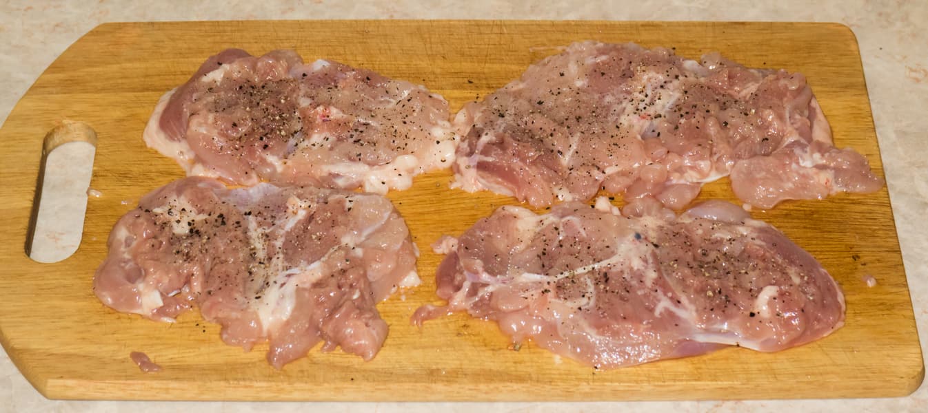 В этот раз для приготовления шавермы мы использовали не традиционную грудку, а филе куриных бедрышек. Расправили и слегка отбили филе так, чтобы выровнять его по толщине. Посолили, поперчили, обмазали растительным маслом.