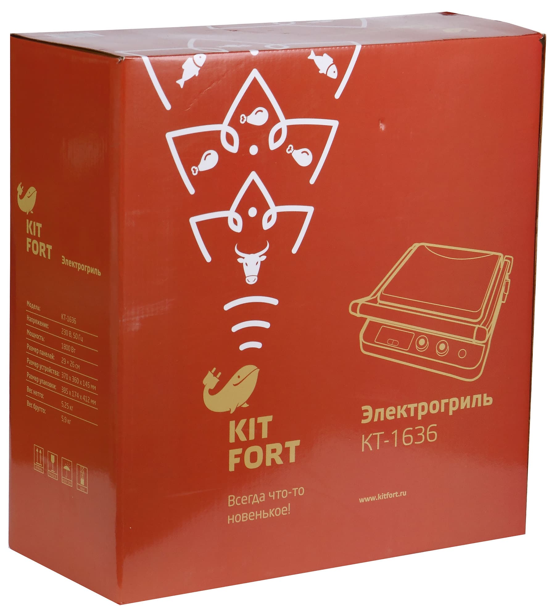 Прибор поступает в магазины в картонной коробке-параллелепипеде терракотового цвета. Коробка оформлена в узнаваемом стиле Kitfort: схематическое изображение прибора, его название и модель, логотип и слоган на фронтальной стороне, технические характеристики и описание прибора — на боковых. Ручкой для переноски упаковка не оснащена.