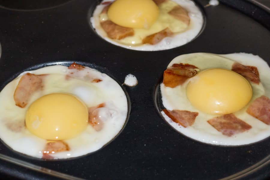 В углубление большого диаметра помещается два яйца. В первый раз яйца вытекли за края, но уже следующий тест получился идеальным.