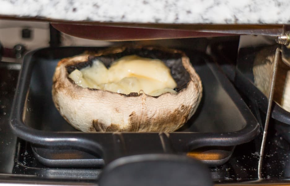 Собственно процесс чрезвычайно прост: выкладываешь кусочки, немного ждешь, затем переворачиваешь. В это время устанавливаешь вниз сковородочку с сыром. Когда продукт достигнет готовности, снимаешь на тарелку и поливаешь растопленным сыром. Мы же успели и растопить сыр, и приготовить еще одно блюдо — фаршированные шампиньоны.