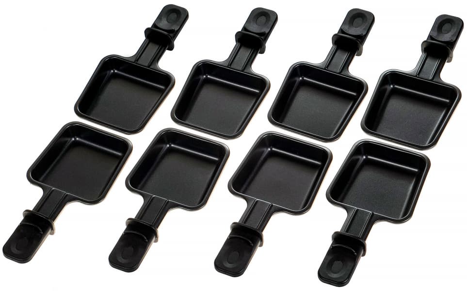 Сковородочки размещаются на нижнем ярусе. Сыр в них плавится и запекается довольно быстро, поэтому мы бы советовали начинать приготовление с поджаривания продуктов, а примерно на середине их готовности устанавливать вниз лотки с сыром.