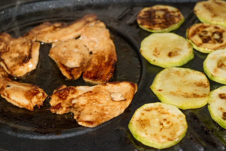 Жарили курицу и кабачки на панели-гриль. Обжарка одной стороны занимала около двух-трех минут.