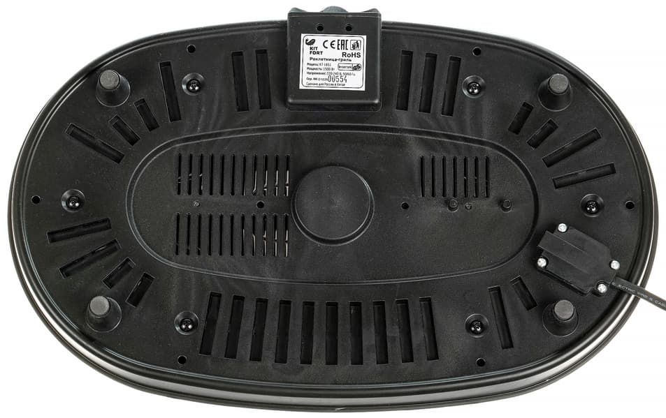 Со стороны дна основания можно увидеть четыре высокие ножки (чуть менее трех сантиметров), множество вентиляционных отверстий и наклейку с краткой технической информацией о приборе. Ножки оснащены резиновыми накладками, противодействующими скольжению. Кабель электропитания соединен с корпусом сбоку. На первый взгляд длина шнура кажется достаточной. Затем приходят мысли о гостях вокруг стола и вопросы о том, как же будет установлен этот стол, и есть ли неподалеку розетка. Тестирование показало, что никаких проблем с размещением раклетницы на столе не возникает.
