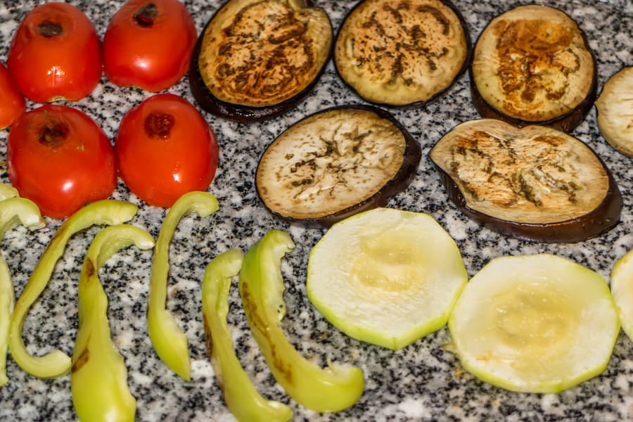 Для поджаривания овощей решили воспользоваться каменной плитой. Установили ее на основание так, чтобы сторона с бороздкой оказалась снаружи. Пока плита раскалялась, подготовили продукты: кабачок, баклажаны, болгарский перец и помидоры. Смазали маслом и плиту, и кусочки овощей.