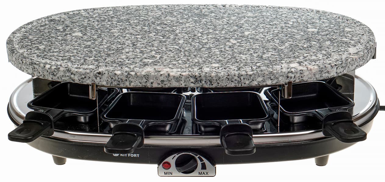 Однажды мы уже тестировали раклетницу. Напомним, что, несмотря на первоначальные опасения и настороженность, в результате и сама идея, и аппарат нас очаровали. Kitfort KT-1651 является устройством более универсальным, чем просто прибор для плавления сыра. Раклетница имеет два яруса: на нижнем в порционных сковородочках плавится сыр, а на верхний устанавливается панель, на которой можно обжаривать разнообразные продукты. В комплект входят три сменных панели, открывающие невероятно широкие возможности по использованию устройства.