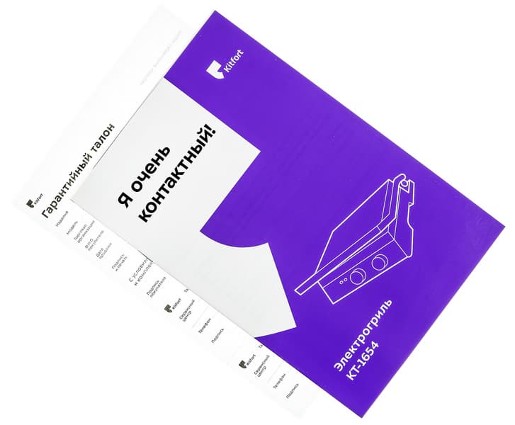 Руководство по эксплуатации Kitfort KT-1654 занимает 10 страниц в меру мелкого текста на белой бумаге формата А5. Оно представлено на русском языке и традиционно содержит всю необходимую информацию в доступном изложении. Первая же страница напоминает пользователям телефон и адрес электронной почты, по которым можно задать вопросы о продукции бренда. Далее мы можем ознакомиться с устройством и функционалом гриля, управлением и уходом за прибором. Помимо технических характеристик и мер предосторожности нам помогла таблица типичных неполадок, где мы нашли ситуацию с подтеканием жира под нижнюю панель. Производитель рекомендует проверить, ровная ли поверхность под грилем, и подложить под передние ножки доску или свернутую газету.
