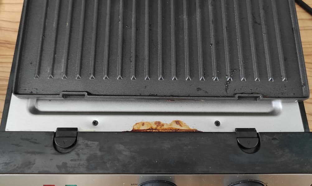 Бортики по всему периметру способствуют стеканию сока и жира в поддон, однако в процессе тестирования часть жидкости просочилась под нижнюю панель к нагревательному элементу. Причина может быть в зазоре 1-2 мм между ней и корпусом.