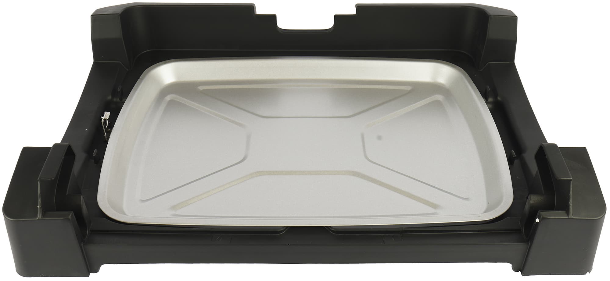 Панель с антипригарным покрытием двусторонняя. С одной стороны — ребристая, с другой — гладкая. Размер панели — 388×288 мм, с несъемными ручками длина доходит до 390. Во время жарки лишний жир и сок с готовящихся продуктов через специальные отверстия в панели стекают в поддон.