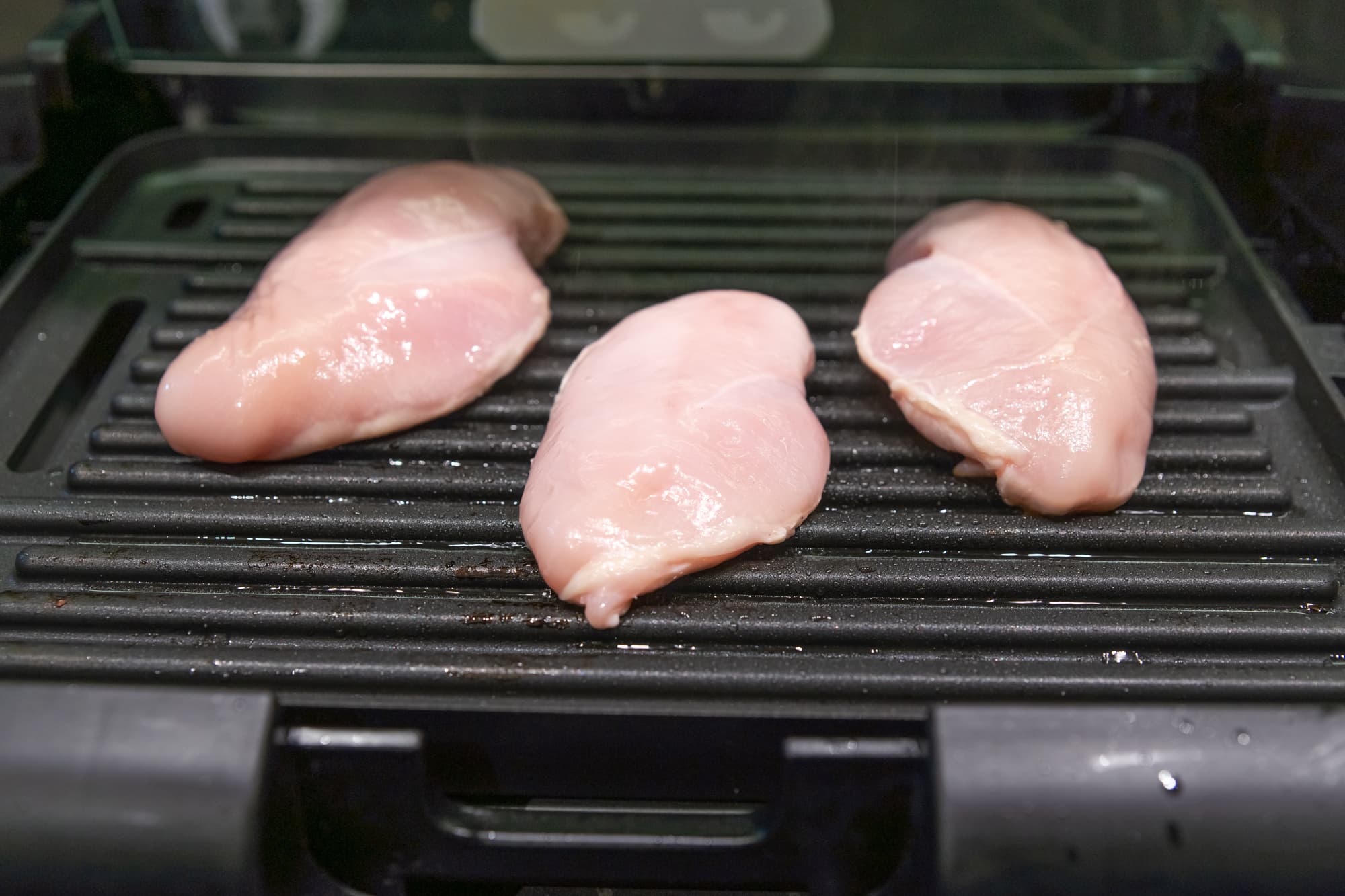 В этом тесте мы мужественно отложили термощуп в сторону. Максимальная температура нагрева для грудки не подходит, и мы выставили ручку на 3: согласно нашим измерениям, это примерно 200-210 °C. Крышку держали закрытой и наблюдали. Пару раз перевернули кусочки.