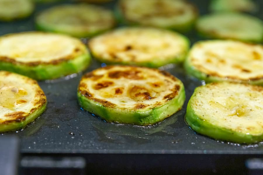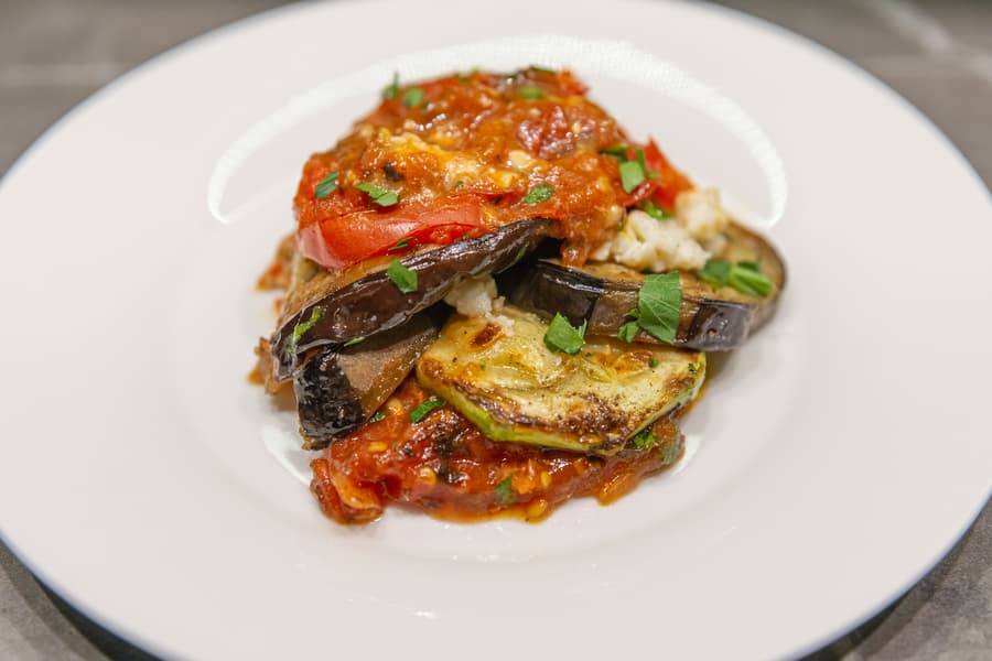 Подобным образом, мы выложили на блюдо еще три слоя: снова кабачки, баклажаны и на самый верх помидоры. Всего у нас вышло 6 слоев. Запеченные на гриле овощи не потеряли форму, остались сочными и мягким внутри.