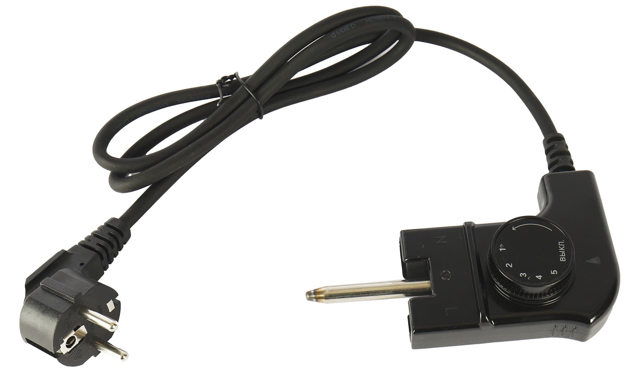 Сбоку к панели крепится регулятор температуры с круглой поворотной ручкой. Он соединяется с гнездом в панели металлическим штырем. Длина шнура — 1 метр.