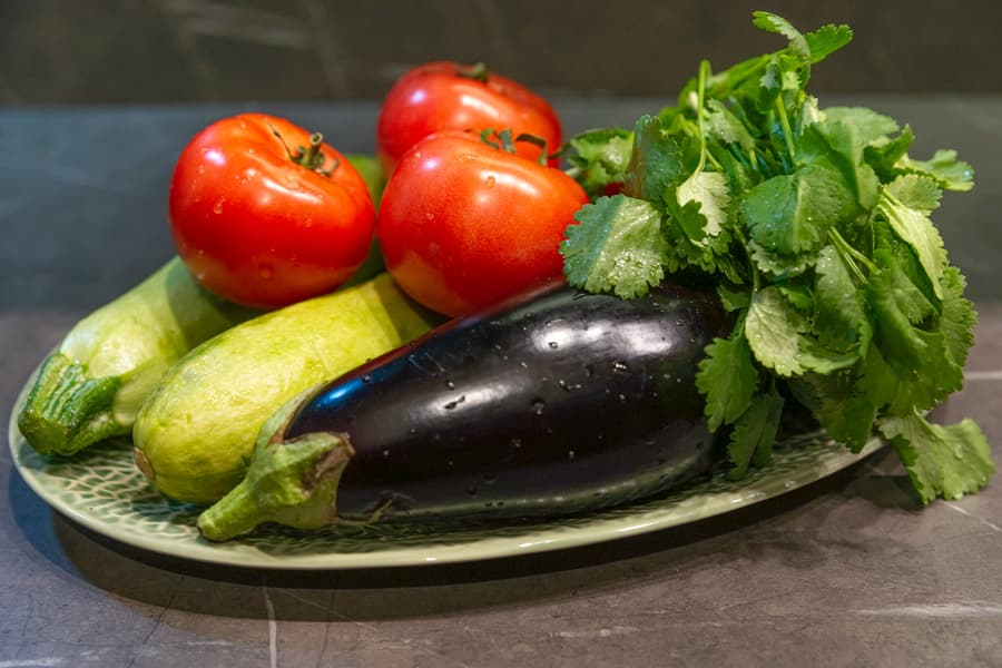 Ингредиенты: 1 баклажан, 4 больших помидора, 2 кабачка, 200 г адыгейского сыра, пара зубчиков чеснока, пучок кинзы, растительное масло, соль и хмели-сунели