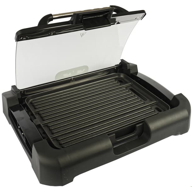 У гриля большая двусторонняя панель с антипригарным покрытием и 5 режимов нагрева с плавной регулировкой температур в диапазоне от 140 до 220±20 °C.