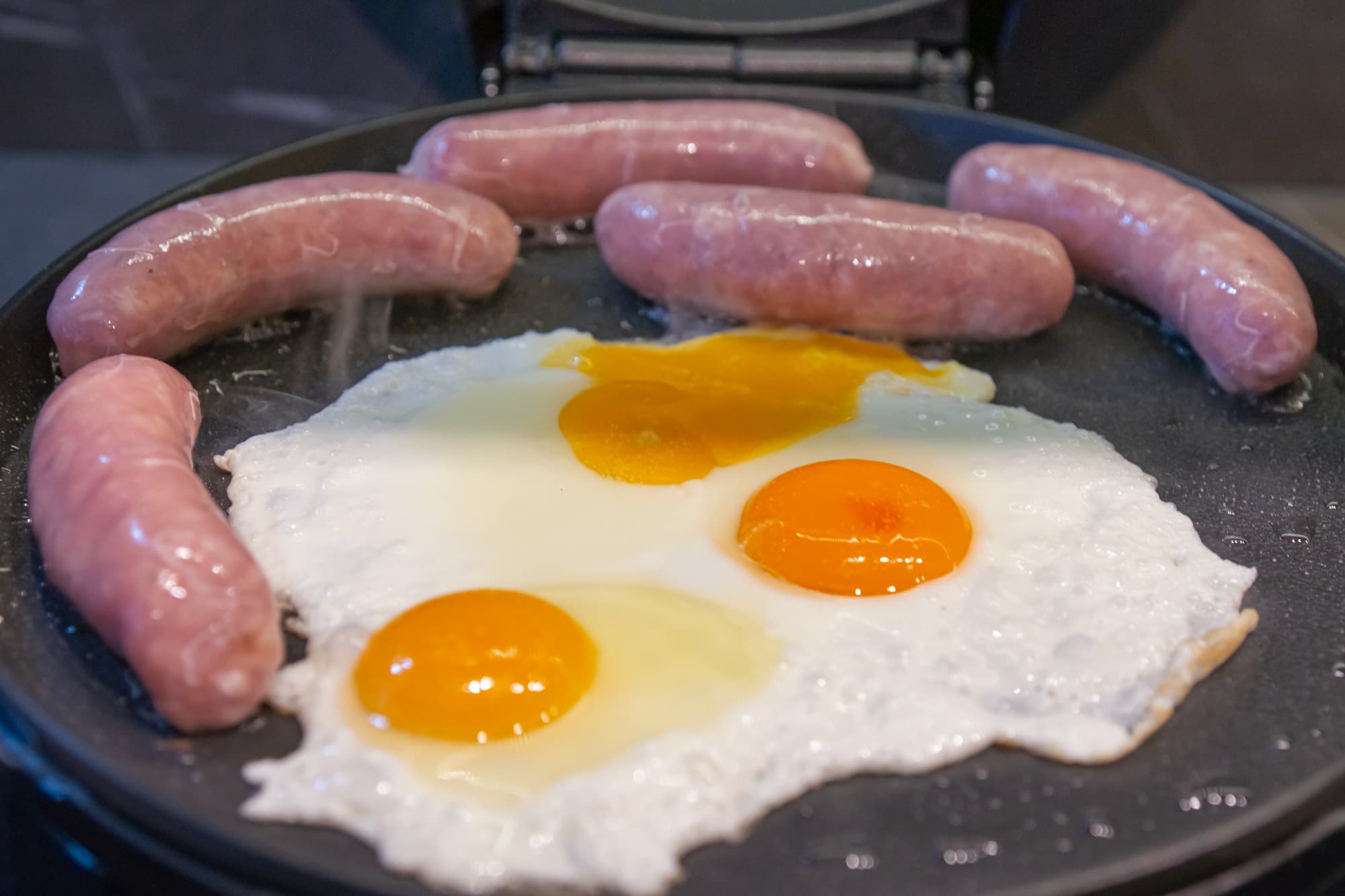 Пиццамейкер — это не только про пиццу. Конструкция прибора позволяет использовать его и в качестве большой сковороды. На разогретую до максимальной температуры панель мы выложили колбаски и разбили три яйца.